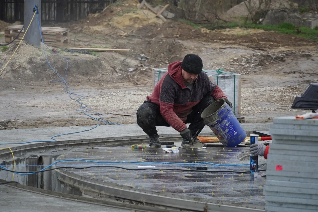 На данный момент идут активные работы по устройству фонтана, выполняется облицовка гранитом.