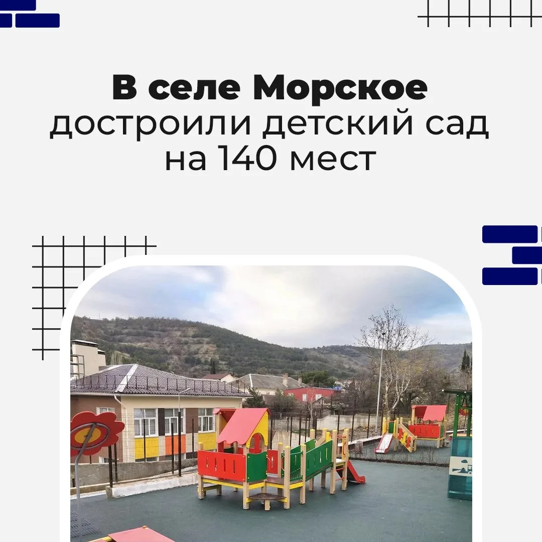 👶 Он расположен в селе Морское. Здание рассчитано на 140 детей: здесь будут созданы 8 разновозрастных групп, в том числе — 2 ясельные.