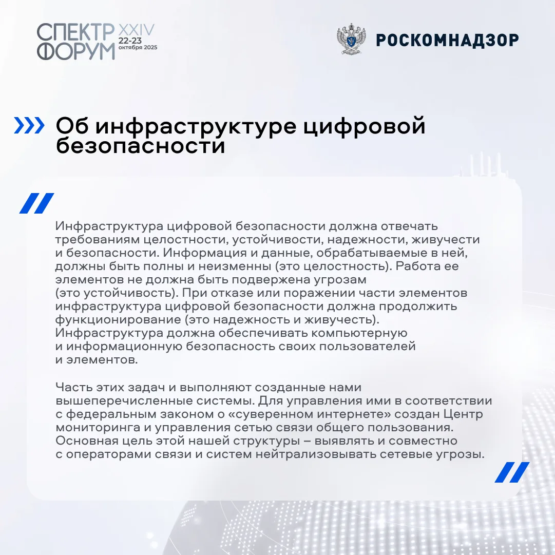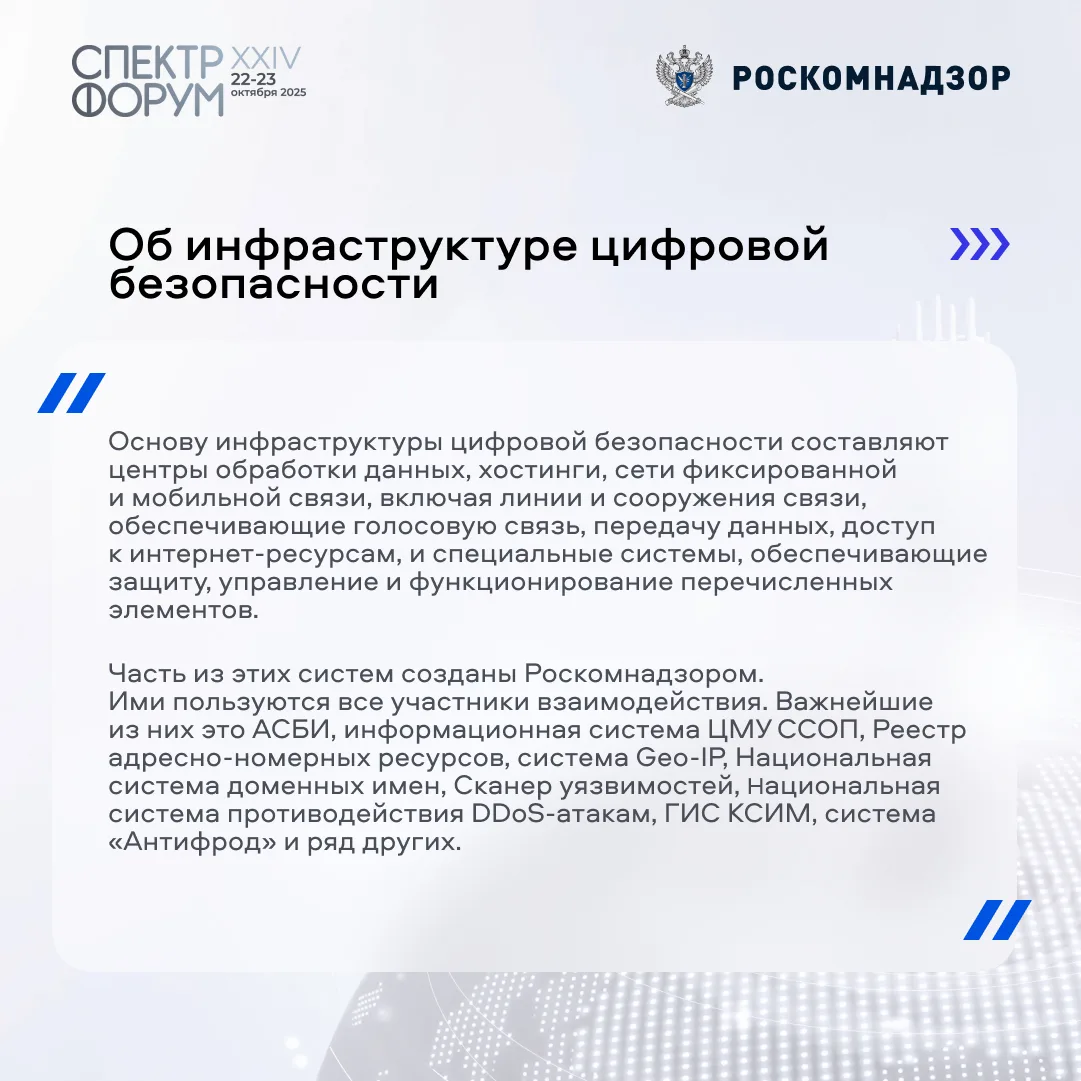 💡 К национальной инфраструктуре цифровой безопасности, обеспечивающей повсеместную и постоянную доступность, безопасность, надежность и устойчивость работы интернет-сервисов, относится и сеть связи страны (включая линии, оборудование, сооружения и средства связи), центры обработки данных и хостинги, «Гео-IP», системы выявления и защиты от сетевых уязвимостей и атак, в том числе DDoS-атак, система блокировки звонков с подменой номера и уже упомянутая автоматизированная система безопасности в интернете, национальные серверы адресации и маршрутизации трафика.