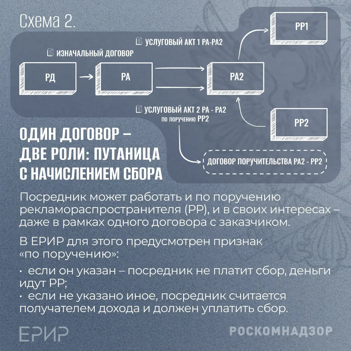 ❌ Когда в одном договоре посредник оказывает услуги заказчику и по поручению рекламораспространителя (РР), и в рамках самостоятельной коммерческой деятельности, система определяет всех, кто находится после этого лица, как плательщиков сбора. Это приводит к ошибкам в расчетах.