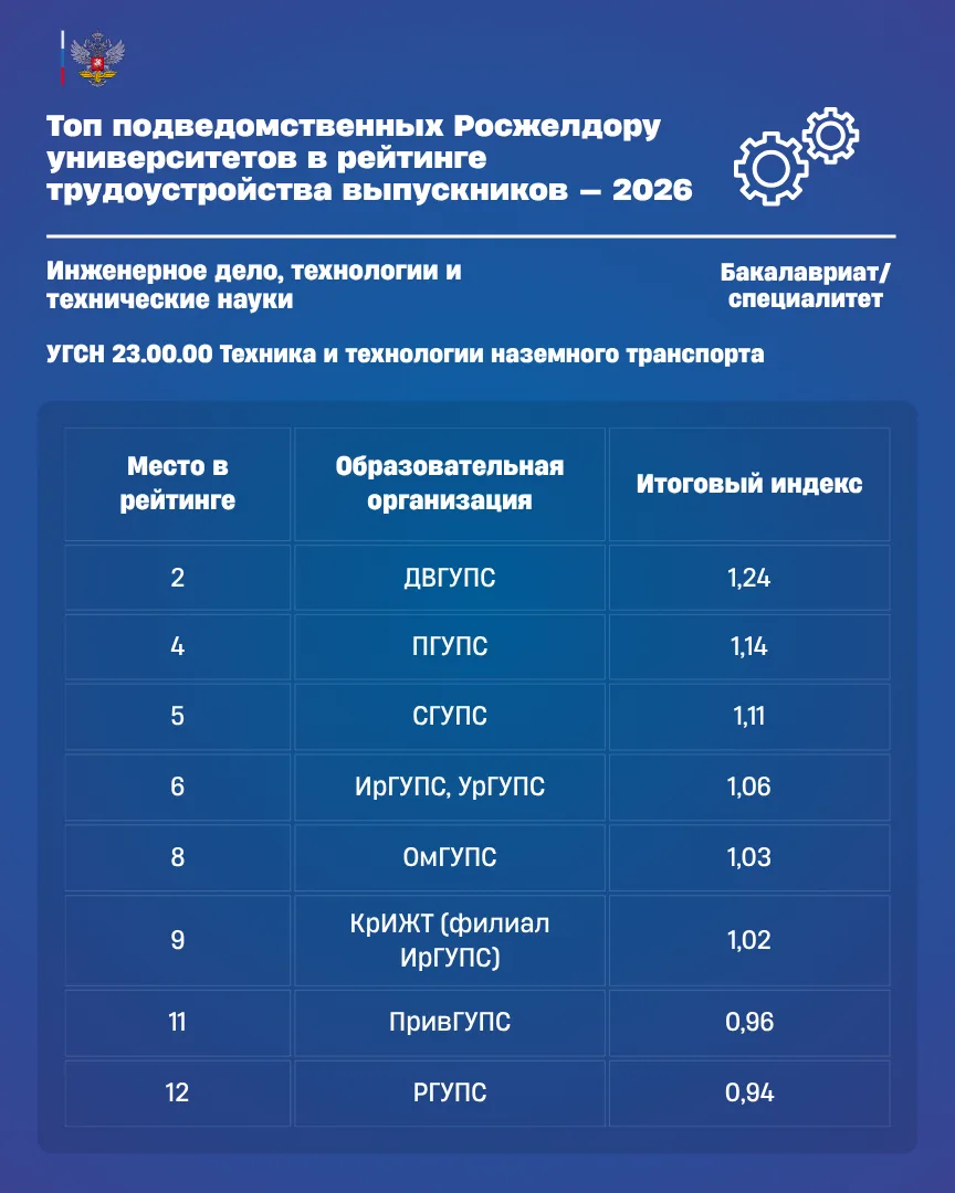 📍 В рейтинге вузов в группе направлений «Инженерное дело, технологии и технические науки» (УГСН 23.00.00 Техника и технологии наземного транспорта) в первой десятке представлены Дальневосточный, Петербургский, Сибирский, Иркутский, Уральский и Омский государственные университеты путей сообщения, а также Красноярский институт железнодорожного транспорта.