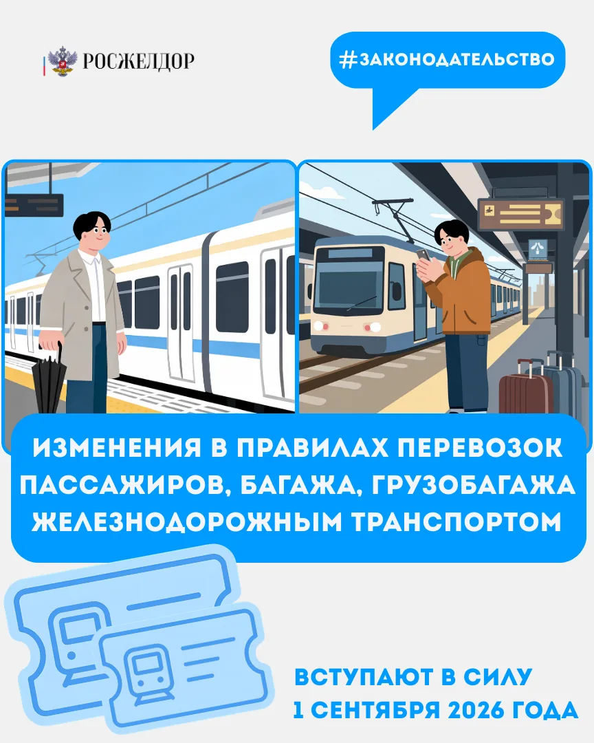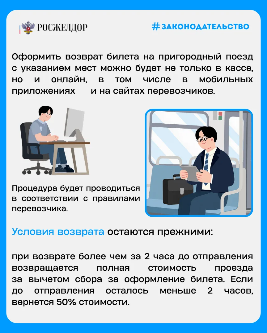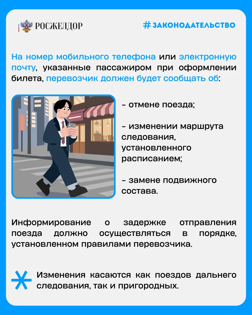 🎫 Перевозчики должны будут уведомлять пассажиров об отмене поезда и изменении маршрута по телефону или электронной почте, а сдать билет на пригородный поезд теперь можно будет онлайн