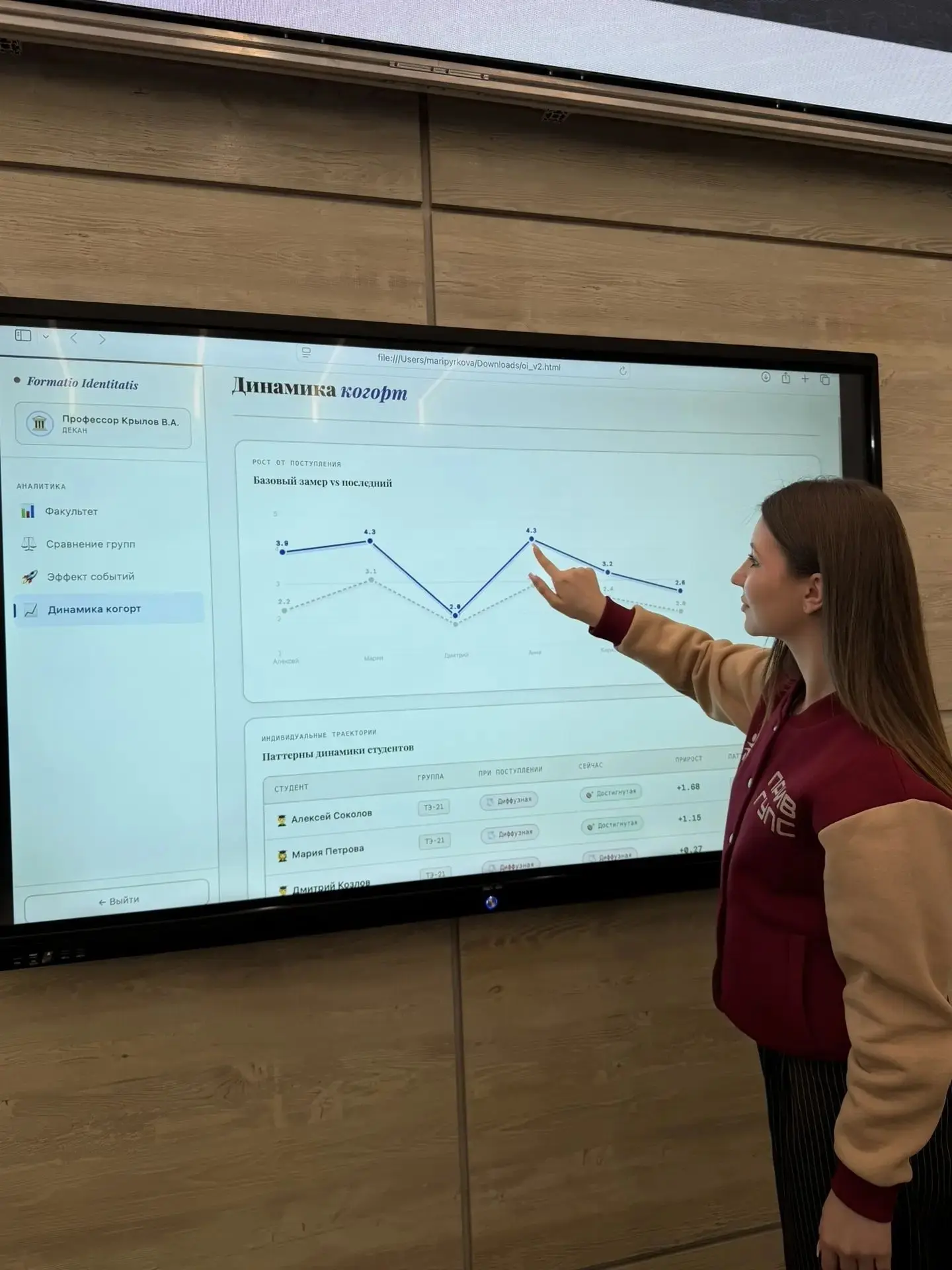 Сервис включает в себя чат-бот, аналитический модуль, профиль студента по четырём компонентам и рекомендации сразу трём участникам процесса — самому учащемуся, наставнику и куратору.