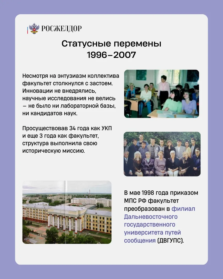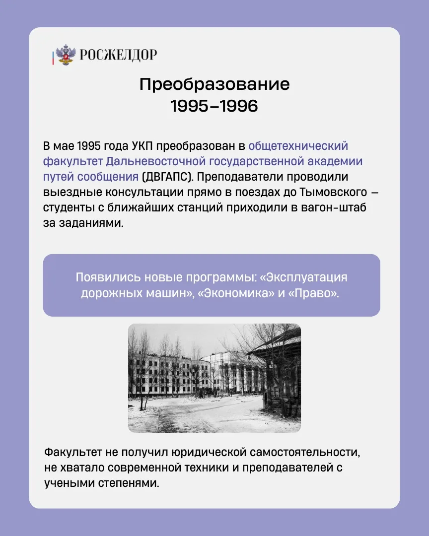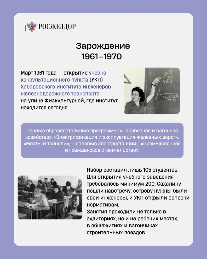 🚀 За это время из учебно-консультационного пункта заочного отделения Хабаровского института инженеров железнодорожного транспорта (ХабИИЖТ) учебное заведение выросло в институт, где сейчас учится свыше 1700 человек.