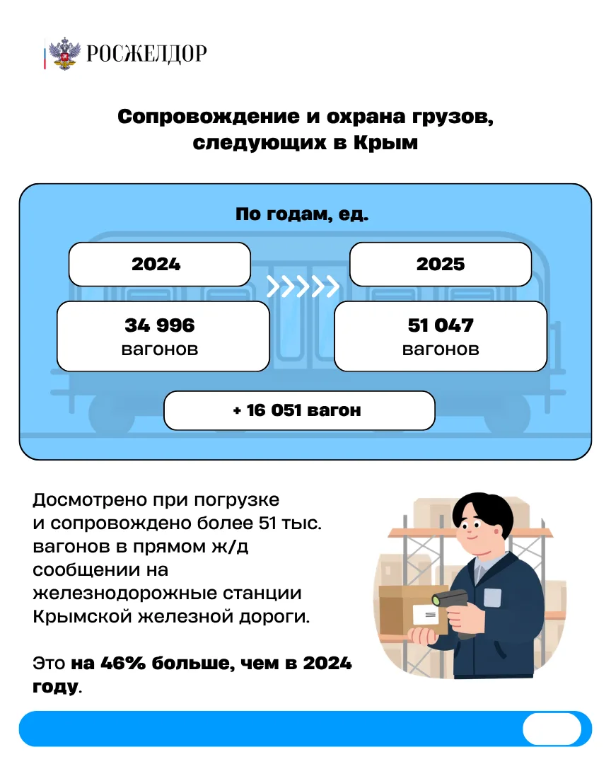 🔹Существенно вырос объем сопровождения грузов направлением на Крым — более чем на 16 тысяч вагонов или 46% в сравнении с 2024 годом.