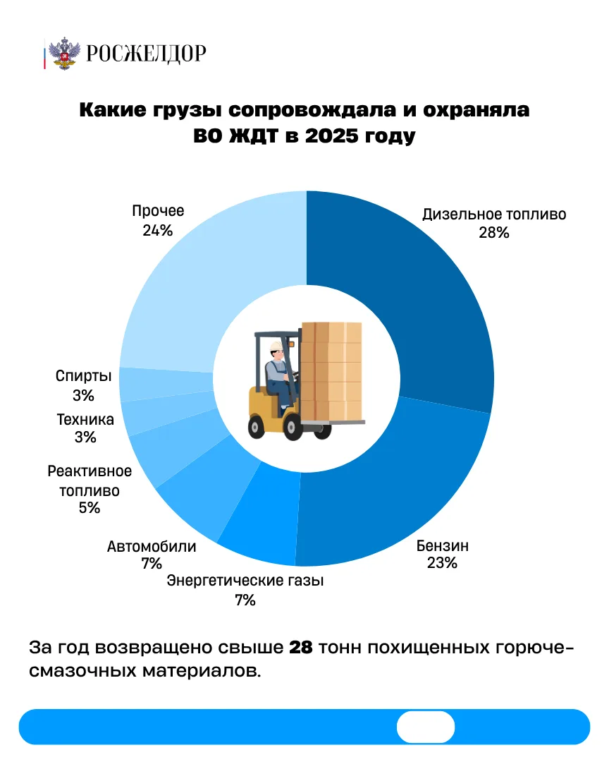 🔹В сфере сопровождения грузов основная доля услуг приходится на специальные грузы, составляющие около 80% от общего объёма. В эту категорию входят бензины, топливо для реактивных двигателей, топливо дизельное всех наименований, спирт метиловый, газ энергетический, а также воинские грузы. Это подтверждает ключевую роль ведомственной охраны в обеспечении безопасности стратегически важных грузов.