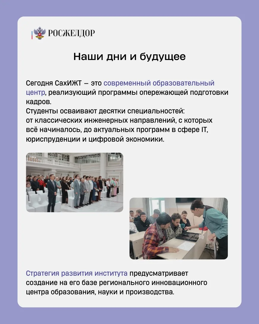 📍Сегодня СахИЖТ — филиал Дальневосточного государственного университета путей сообщения. В год окончания вуза не менее 70% выпускников трудоустраиваются по своей квалификации.