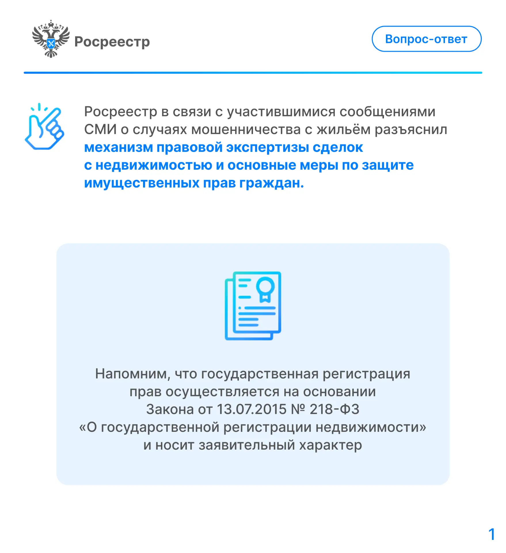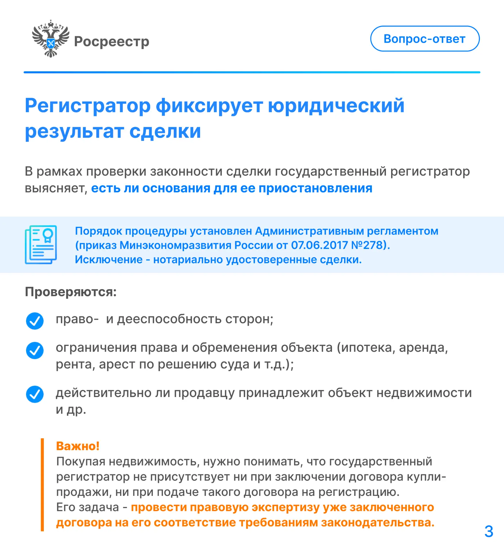 🏡 Друзья, в связи с участившимися сообщениями СМИ о случаях мошенничества с жильём подготовили для вас инфокарточки, где рассказали, как проводится проверка законности сделок с недвижимостью и что обязательно должен выяснить государственный регистратор прав.