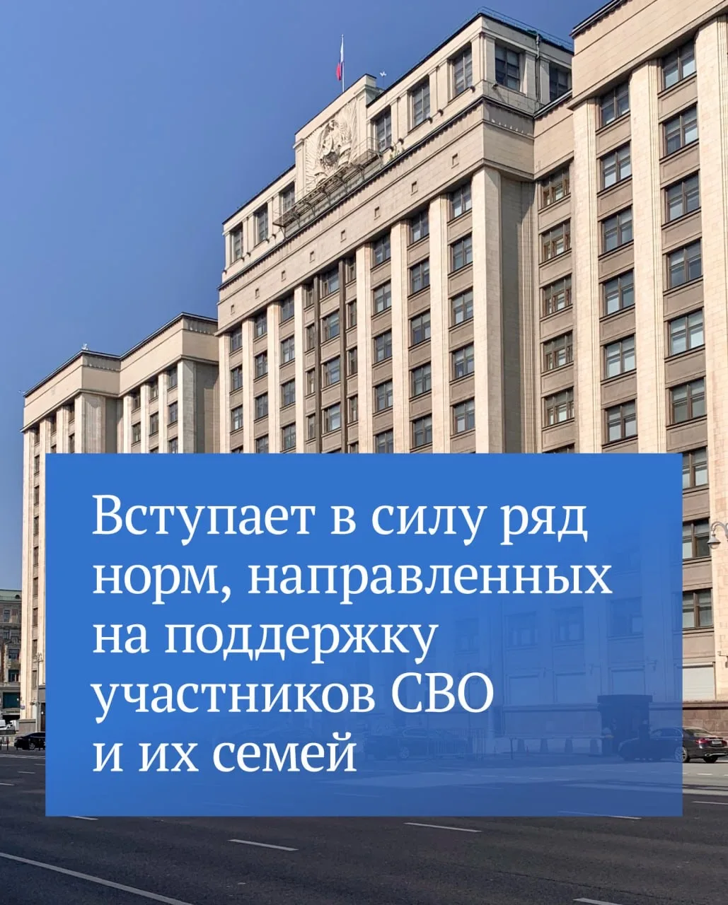 Сегодня вступает в силу ряд законов о поддержке участников специальной военной операции, их родных и близких.