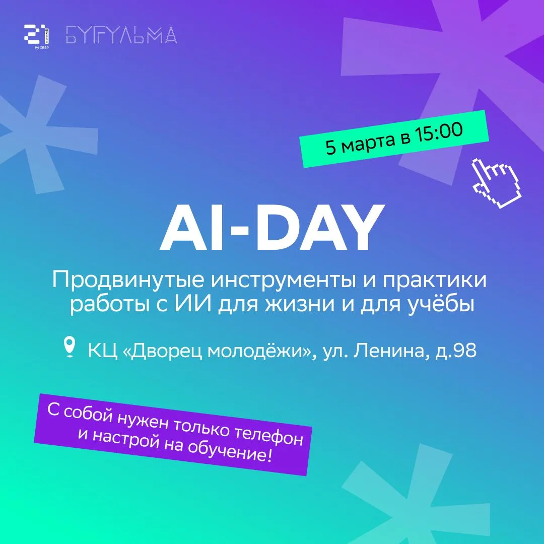 Занятия пройдут во Дворце Молодёжи - в 15.00 - для продвинутых пользователей, которые уже пользуются нейросетями, в 18.00 - для новичков, которые пока только знакомятся с миром искусственного интеллекта.