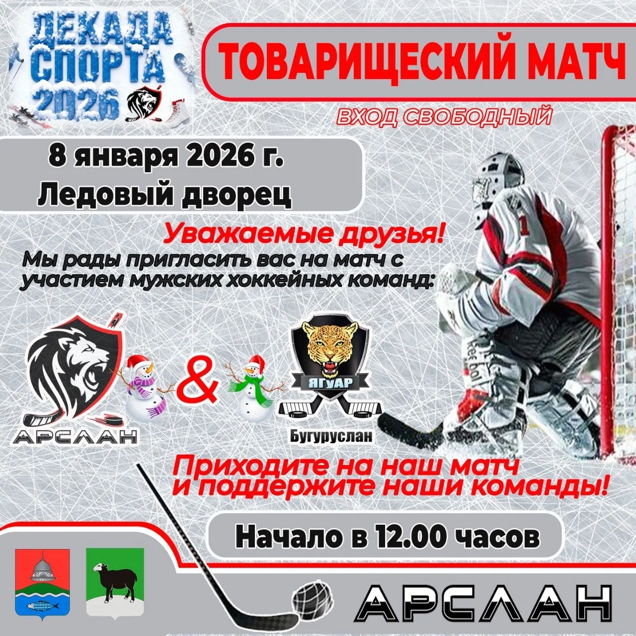 ❄️🏒Новогодние каникулы продолжаются! Приглашаем сегодня всех любителей хоккея на товарищескую встречу мужских команд, которая состоится в Ледовом дворце Бугульмы.