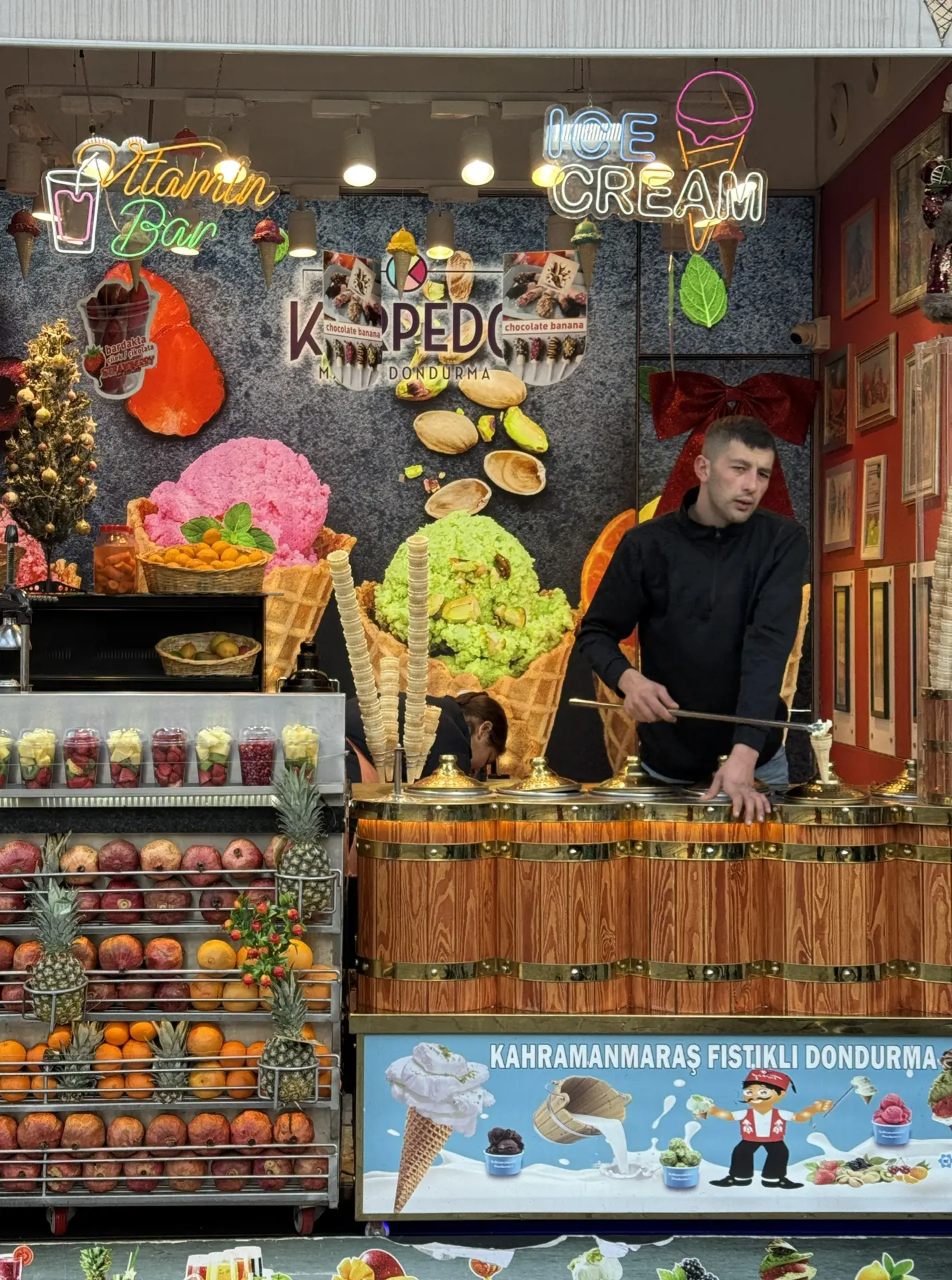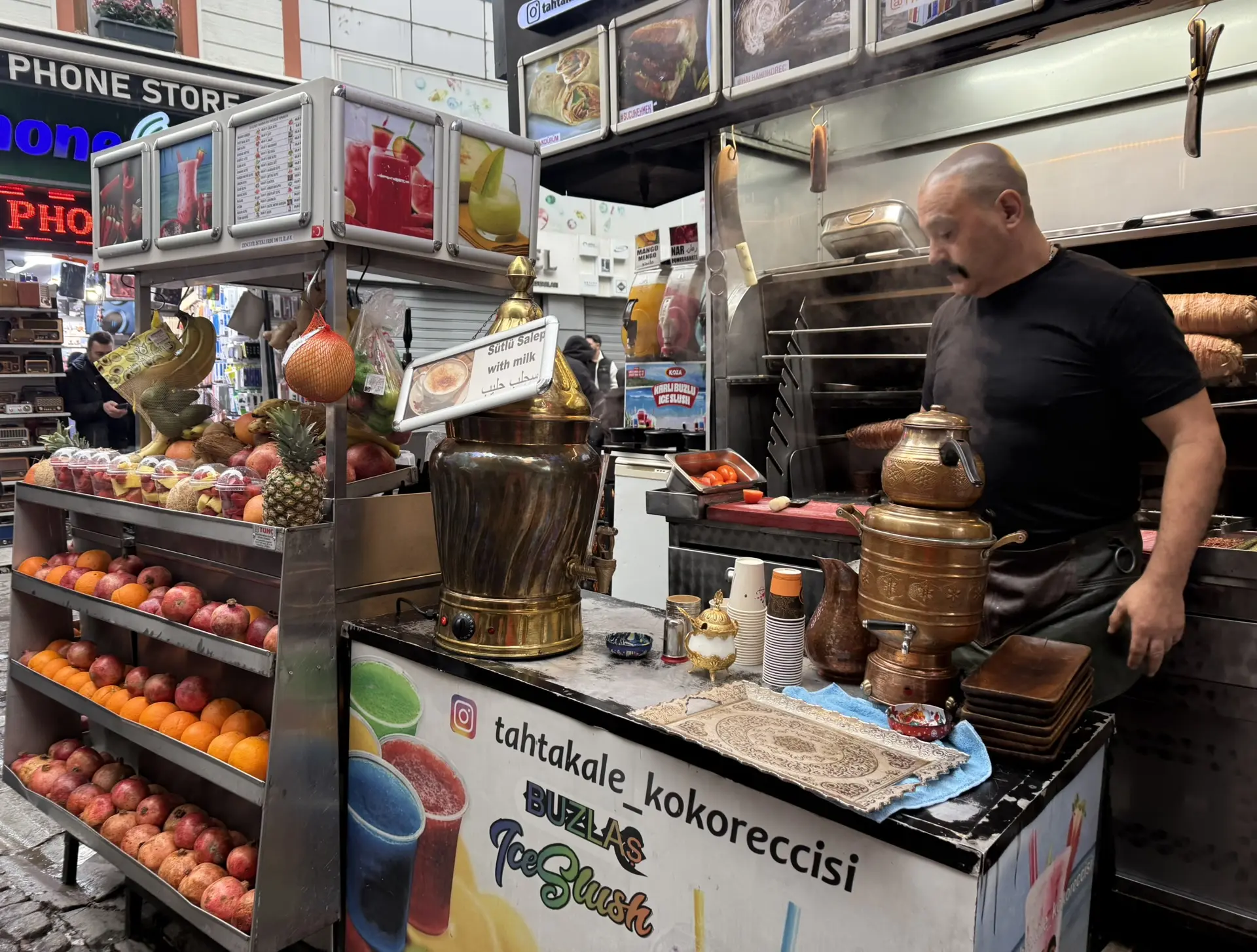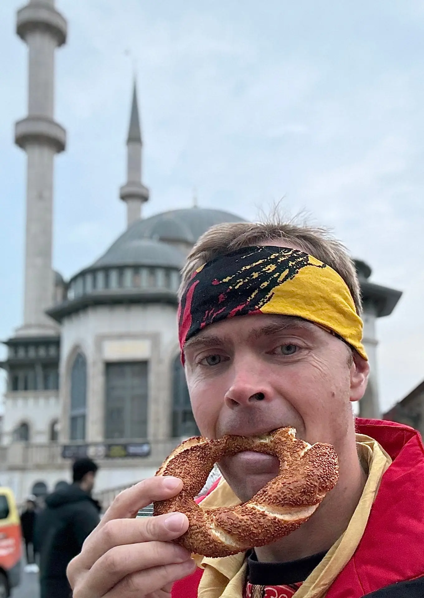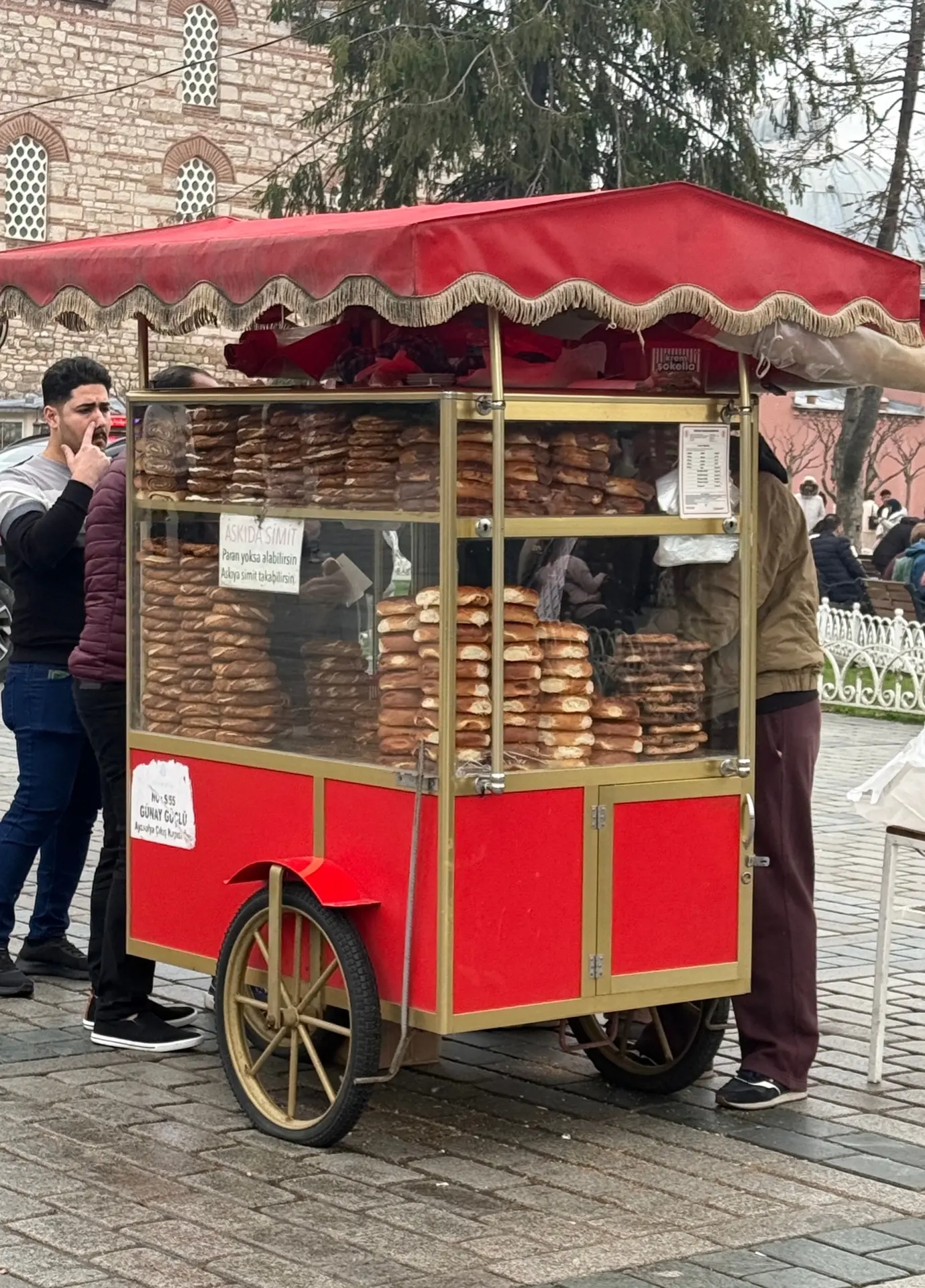 Четвертый кит - это уличная еда, а точнее, симит — так в Стамбуле называют круглый бублик, покрытый семенами кунжута. Это символ стамбульской уличной еды, визитная карточка турецкой кухни, появившаяся в 19 веке. Первоначально он продавался с красных тележек или с подносов, которые продавцы носили на голове. Сейчас же торговцев с бубликами на головах практически не встретишь; я видел такого лишь однажды за всё время, а вот найти красную тележку можно на каждом углу.