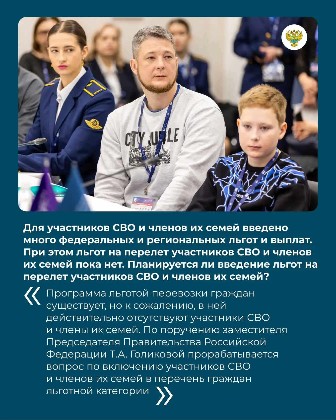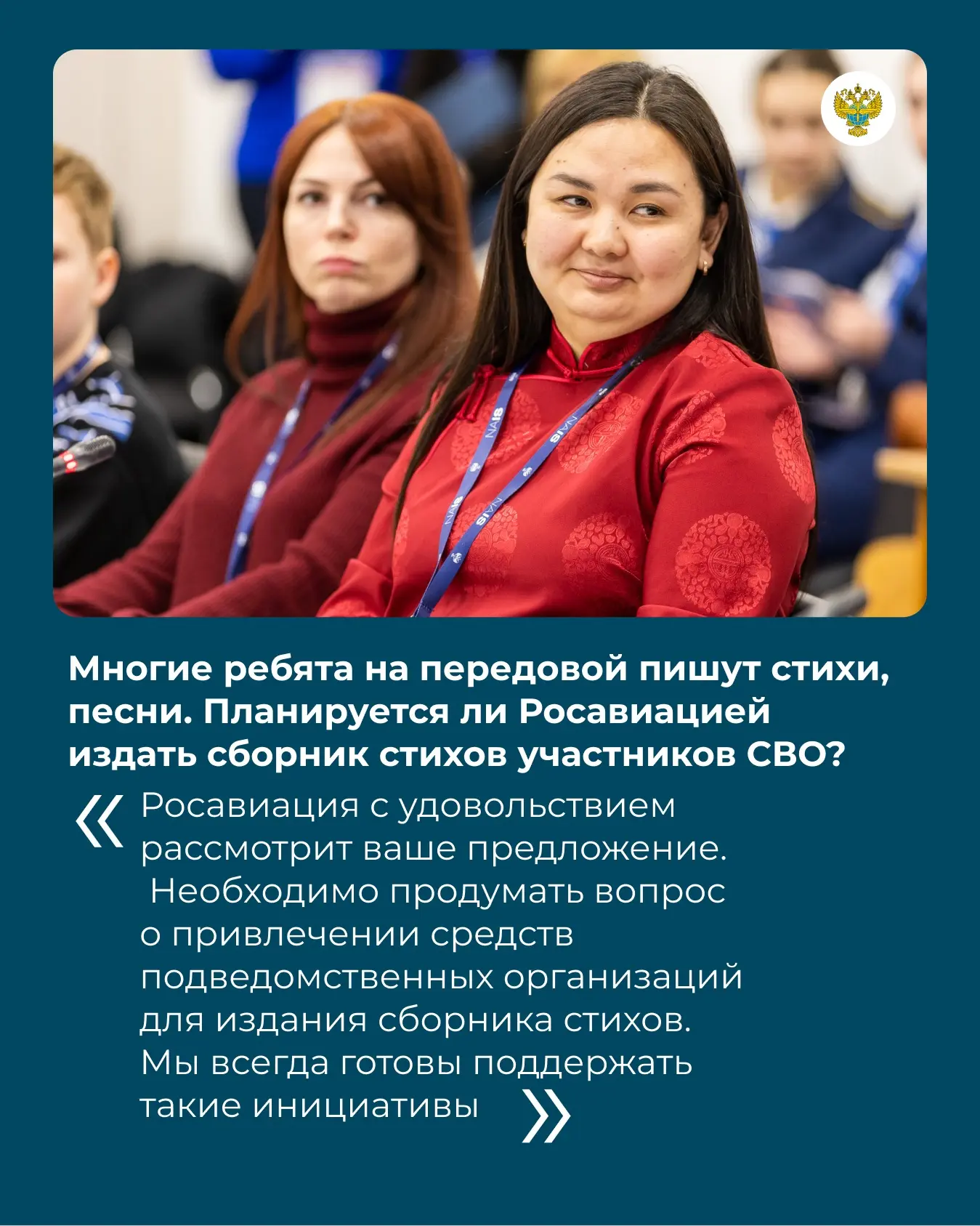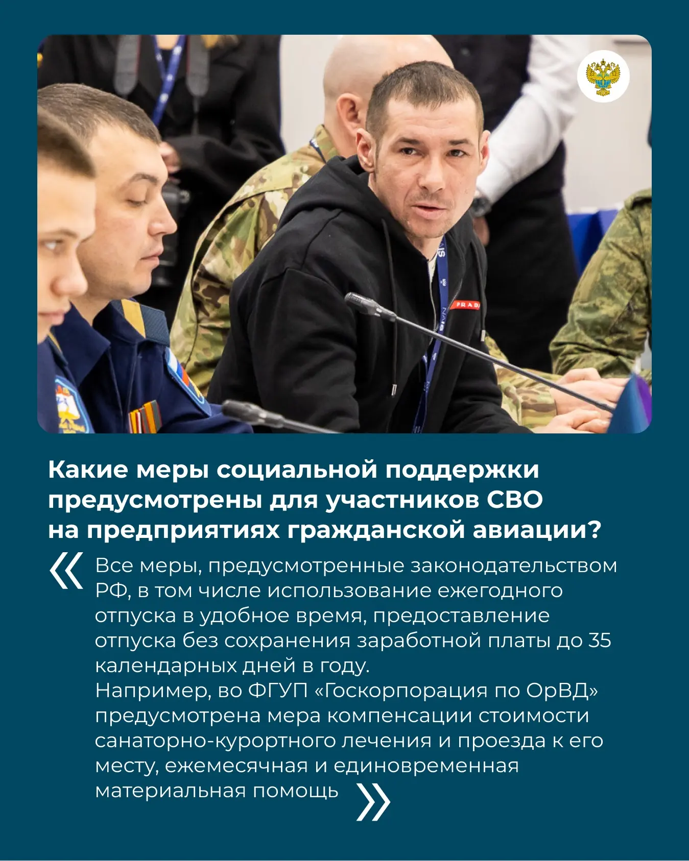 «Росавиация системно работает над реализацией мер, направленных на защиту интересов участников спецоперации, в их числе — трудоустройство и социальные гарантии, образовательные льготы и возможность получения второго образования. Помимо этого, коллективы наших учреждений выходят с инициативами по гуманитарной поддержке. Объем и формат помощи активисты определяют самостоятельно, в соответствии с запросами защитников»,