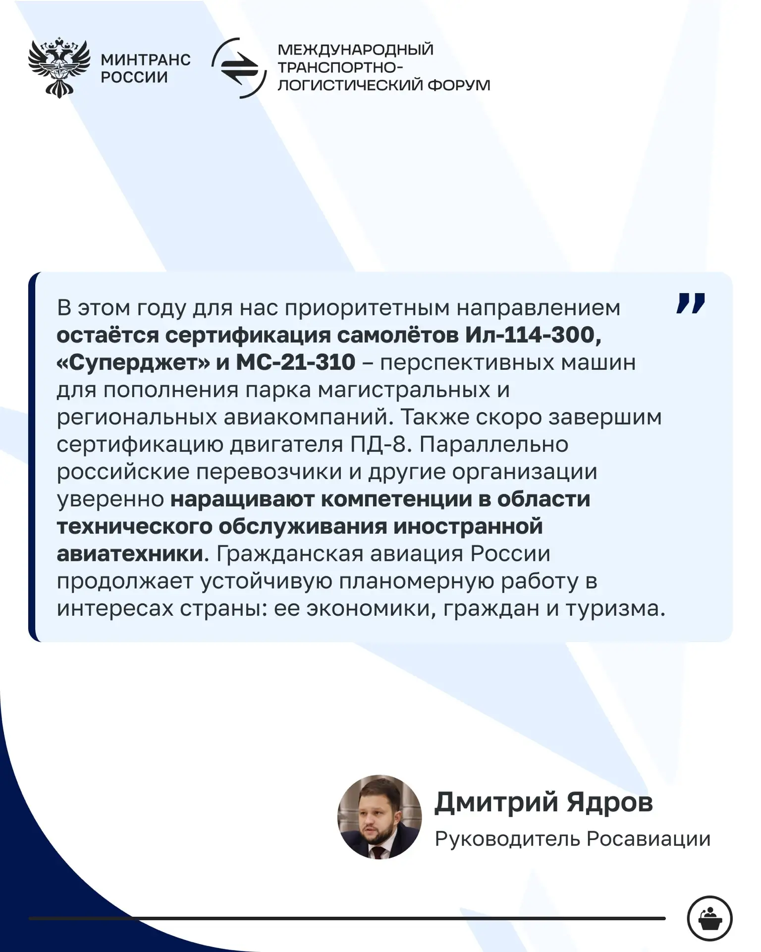 ▫️До 50% необходимо довести долю самолетов отечественного производства в парке российских авиаперевозчиков. Завершается сертификация самолета Ил-114, отрасль ожидает завершения сертификации Суперджета и МС-21 с отечественными двигателями ПД-8 и ПД-14.