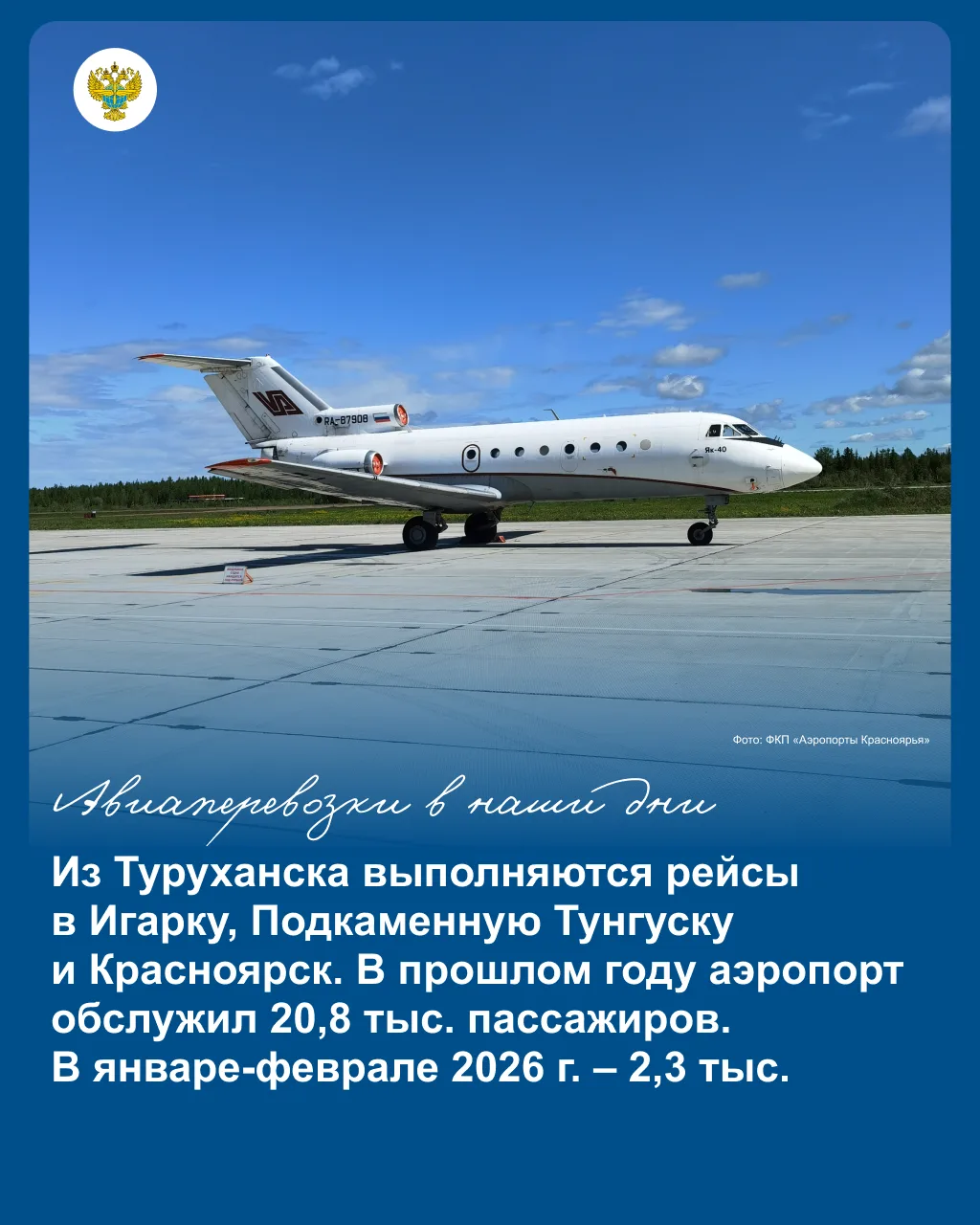 В наши дни рейс из краевой столицы в аэропорт Туруханск (входит в состав подведомственного Росавиации ФКП «Аэропорты Красноярья») выполняется примерно за три часа. Когда закрыта навигация на Енисее, воздушный транспорт – единственный вариант связи труднодоступных поселков с «большой землей».