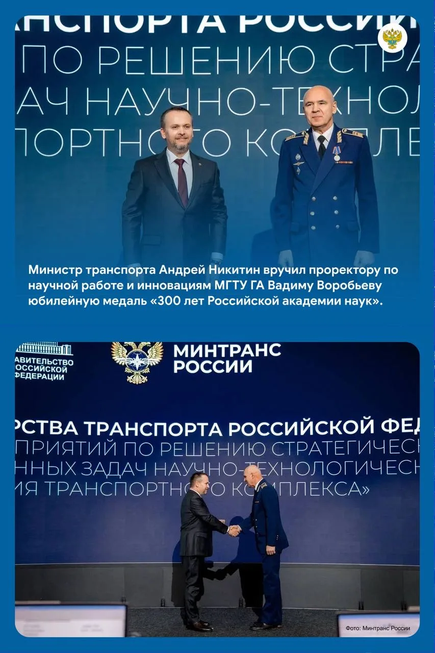 Накануне праздника министр транспорта Андрей Никитин отметил юбилейной медалью «300 лет Российской академии наук» одного из них – проректора по научной работе и инновациям МГТУ ГА Вадима Воробьева.