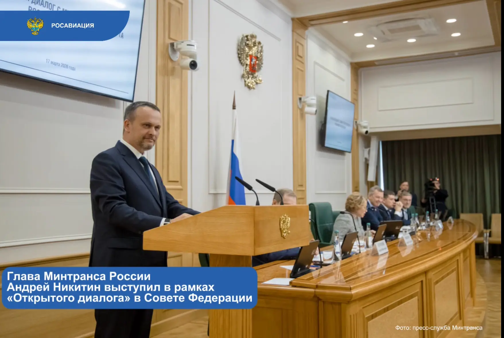 Глава Минтранса России Андрей Никитин выступил в рамках «Открытого диалога» в Совете Федерации под руководством Валентины Матвиенко. Министр представил сенаторам ключевые итоги 2025 года и планы на 2026 год, уделив особое внимание развитию воздушного транспорта.