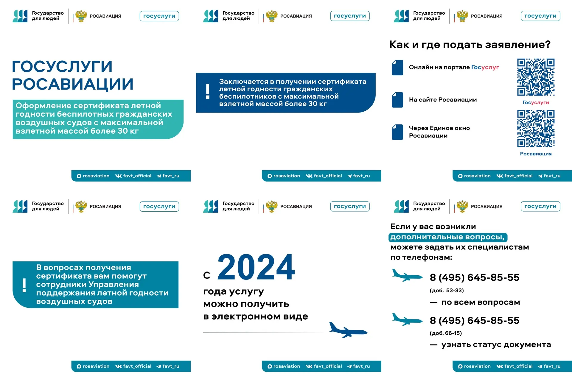 С 2024 года госуслуга по оформлению сертификата летной годности для гражданских БВС тяжелее 30 кг выведена на ЕПГУ. В рамках федпроекта «Государство для людей» Росавиация проводит работу по оптимизации этой госуслуги.
