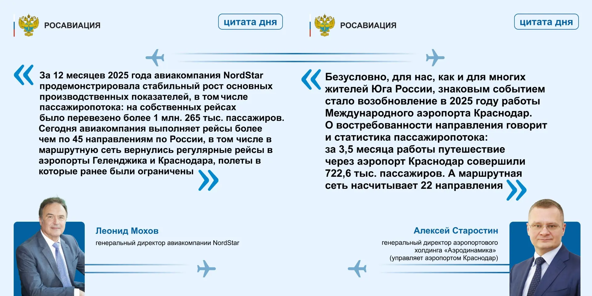 «Показатели перевозок за 2025 год подтверждают устойчивую работу отечественного воздушного транспорта в интересах граждан, несмотря на продолжающееся внешнее санкционное давление, периодически вводимые для обеспечения безопасности полетов временные ограничения, влияющие на ритмичность работы ряда значимых аэропортов Центральной России. Несмотря на эти факторы, развитие отрасли продолжается. Введены новые аэровокзалы, вновь стали доступны и популярны аэропорты Геленджика и Краснодара. Началось регулярное авиасообщение с Абхазией, Саудовской Аравией и Филиппинами»,