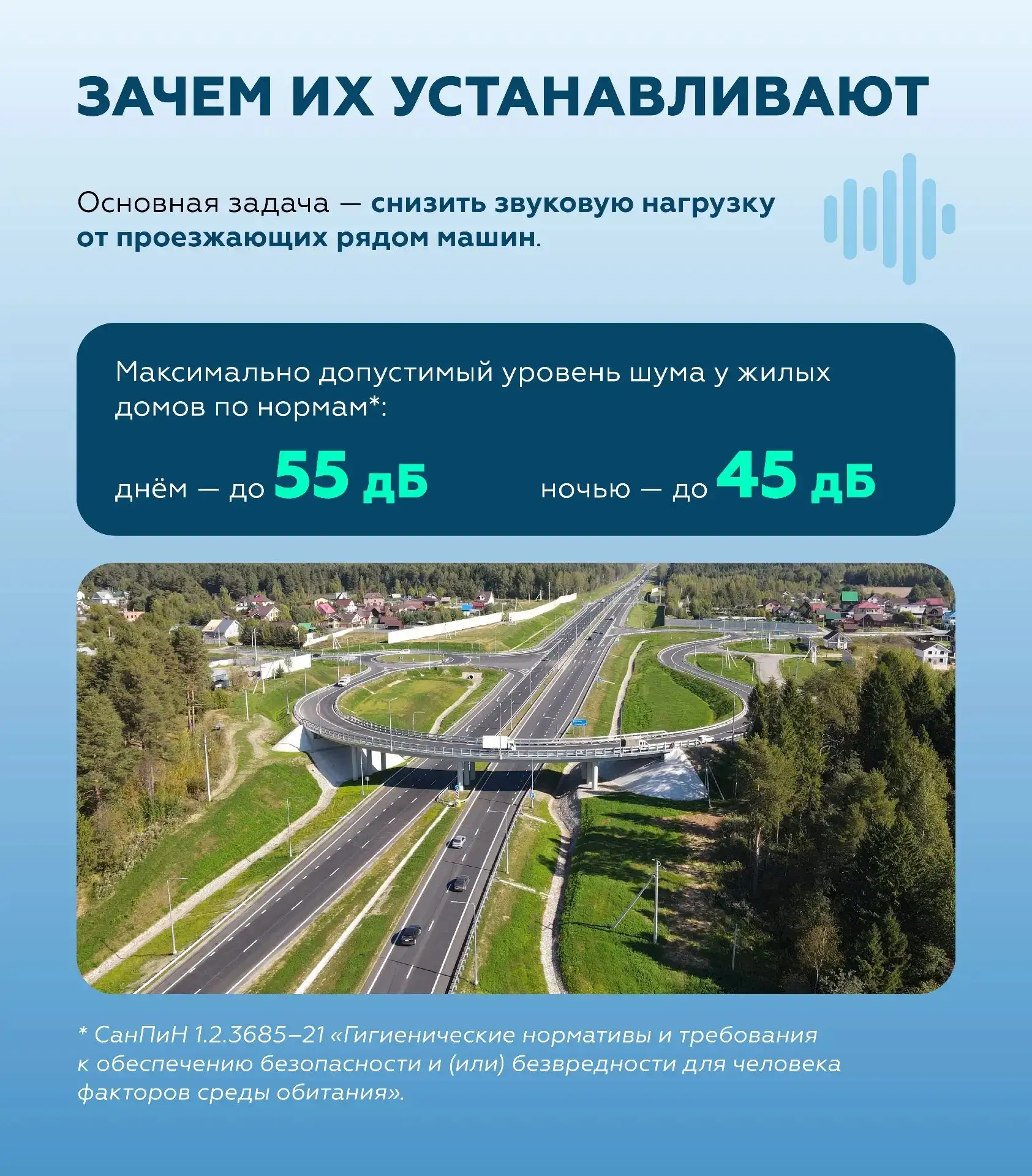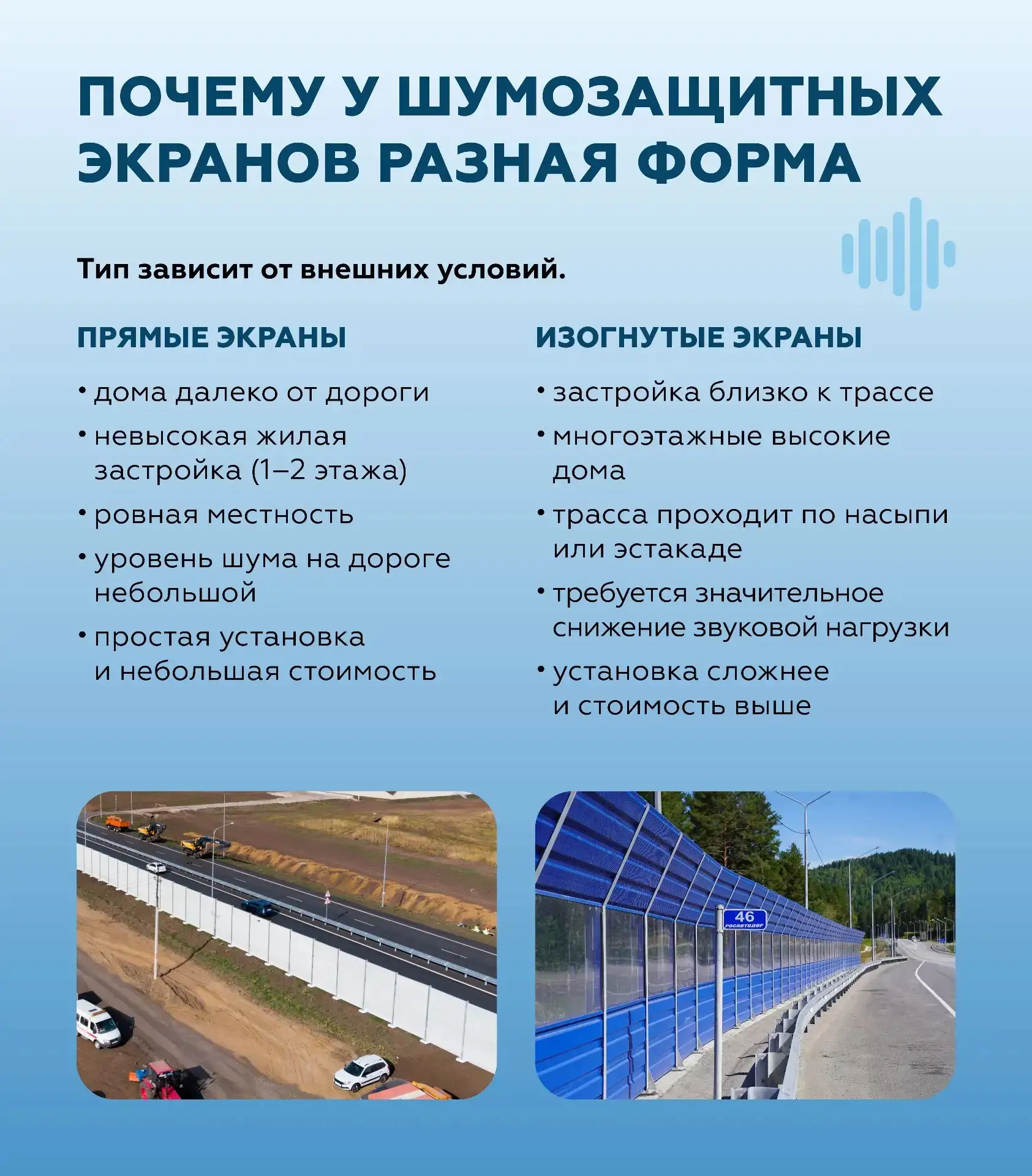 Их можно заметить на федеральных дорогах рядом с жилой застройкой, социальными объектами или зонами отдыха. Задача экранов — снизить уровень транспортного шума и обеспечить санитарно-эпидемиологическую безопасность прилегающих территорий.