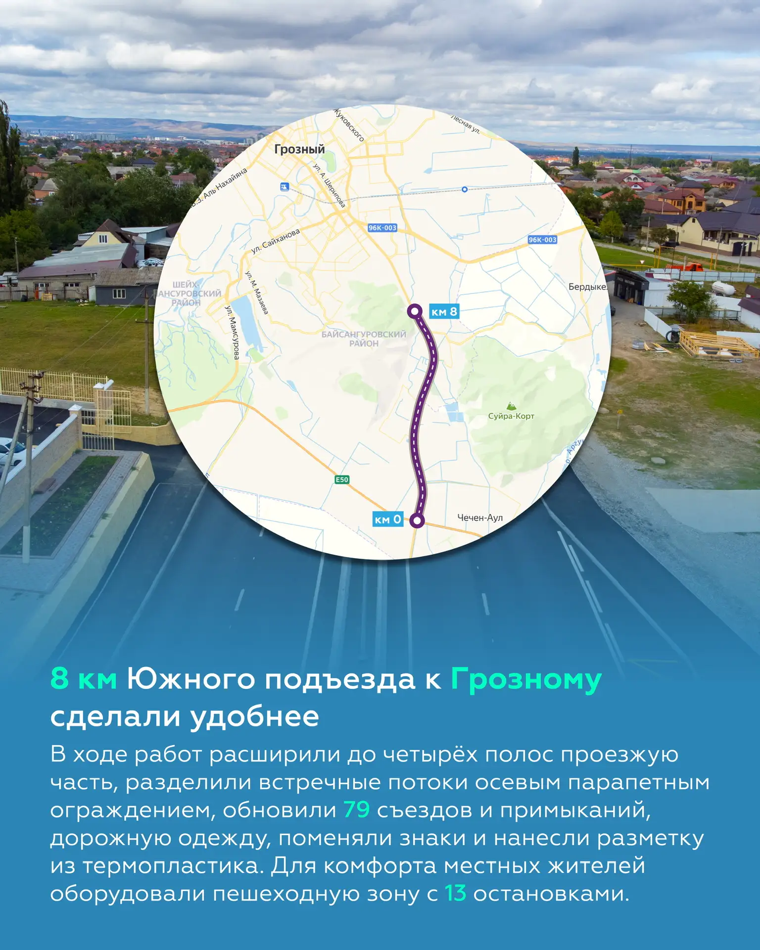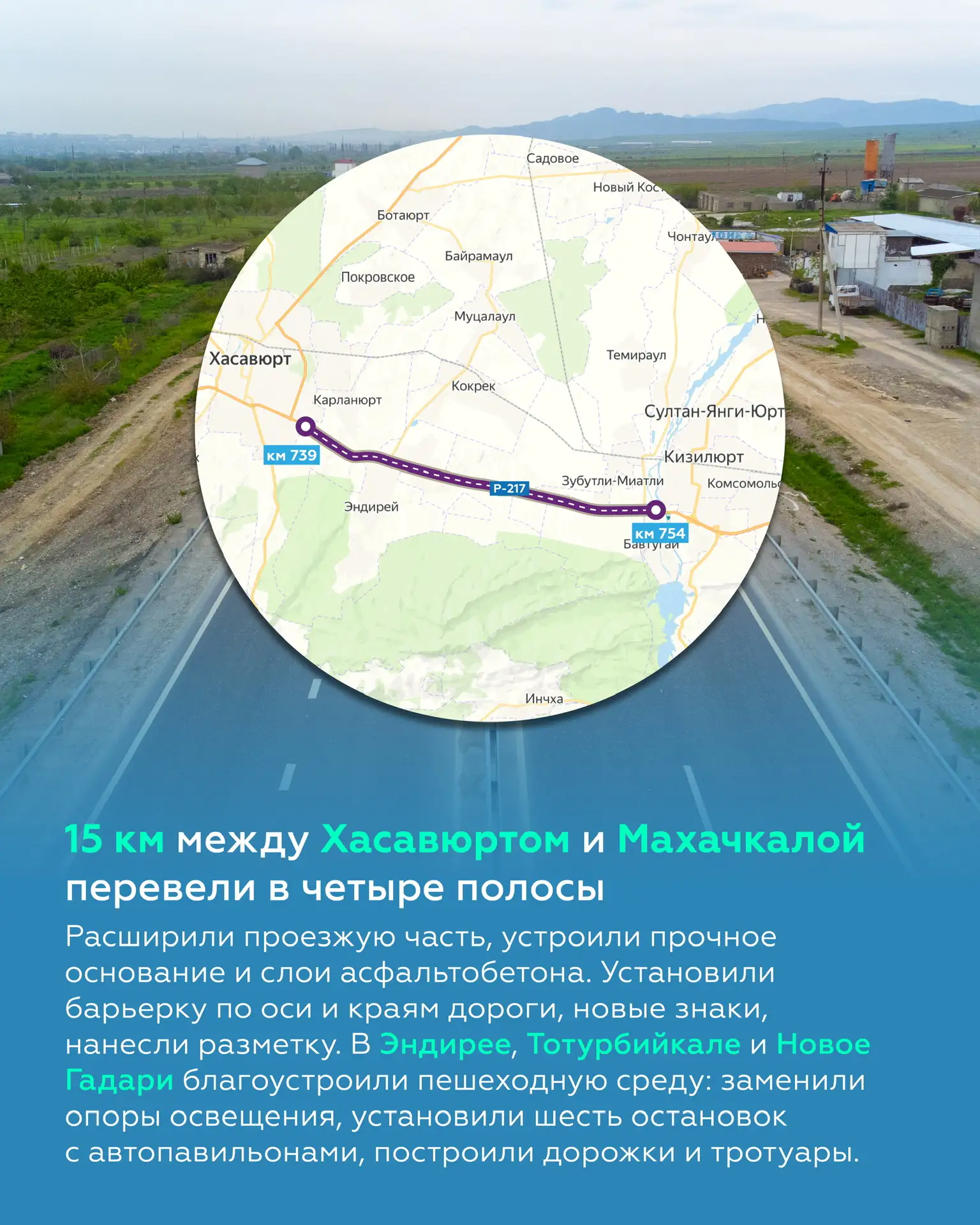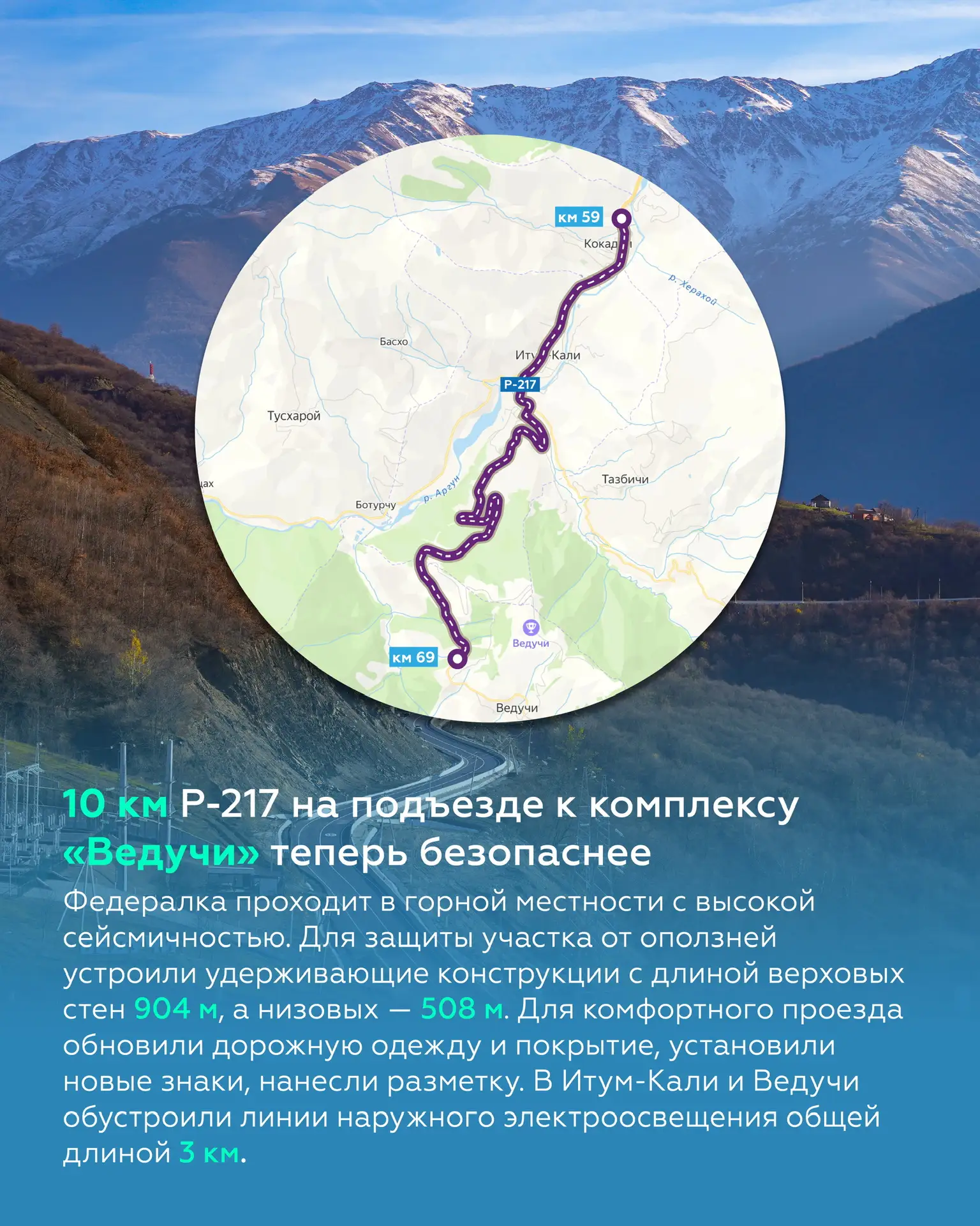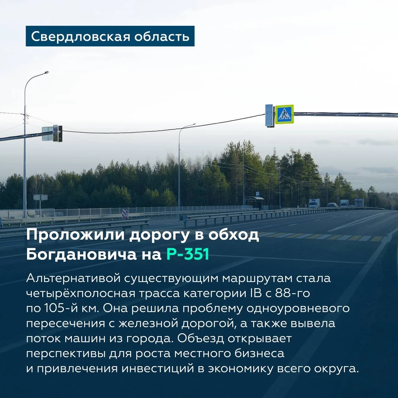 Длина новой четырёхполосной дороги — 12 км. На проезжей части предусмотрены три развязки, две площадки отдыха для водителей, разделительное барьерное ограждение, а ещё освещение и свежая разметка.