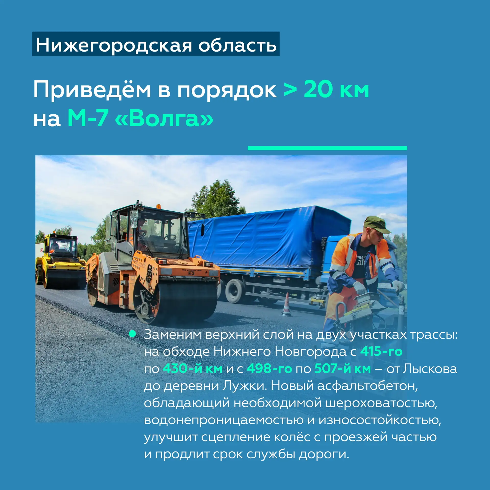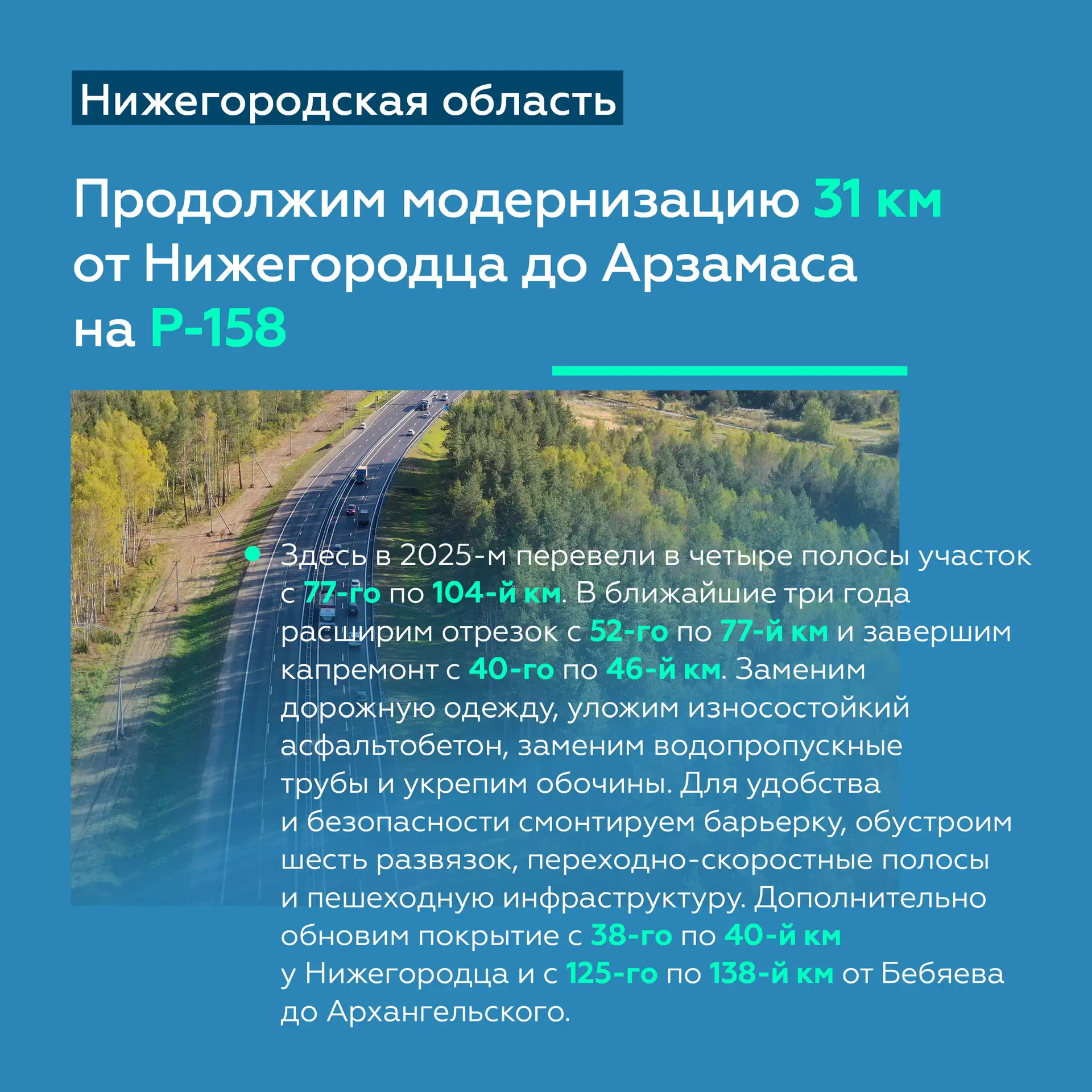 Объекты предстоящих лет — участки трасс Р-158 Нижний Новгород – Саратов, М-7 «Волга» и Р-177 «Поветлужье». На Р-158 работы проведём от посёлка Нижегородец до Арзамаса, на М-7 «Волга» обновим покрытие на двух отрезках, а на Р-177 не только приведём в порядок 83 км, но и капитально отремонтируем два малых моста.