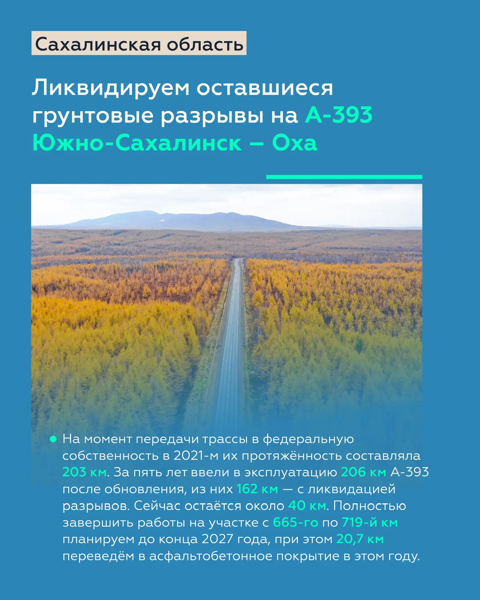 Сахалин всё чаще становится точкой притяжения для путешественников — сюда едут за морскими видами, горными массивами и удалёнными уголками дикой природы. Чтобы путь к этим местам был проще и быстрее, обновляем существующие и строим новые направления.