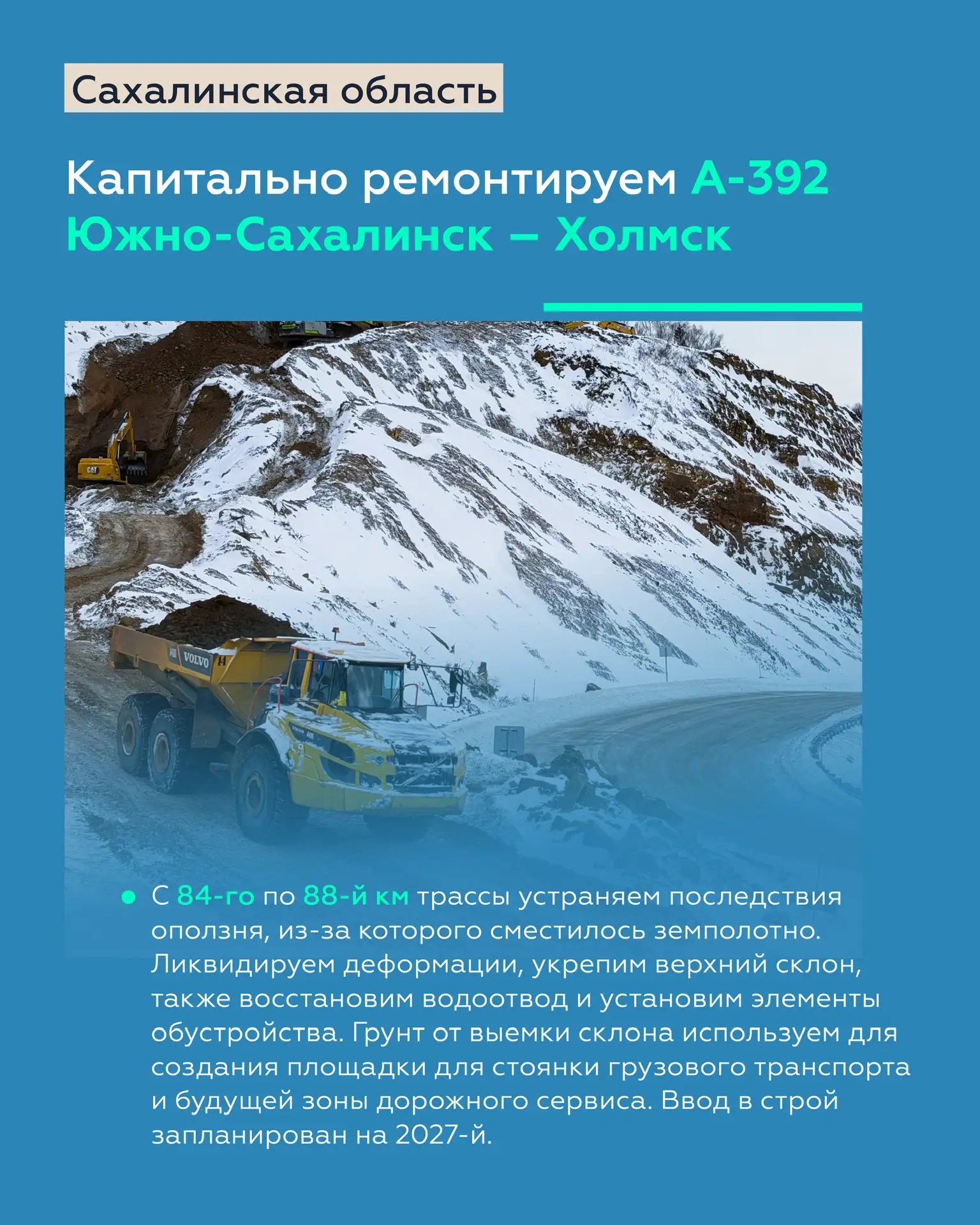 Так, продолжаем капремонт участка А-392 Южно-Сахалинск – Холмск, где выполняем комплекс мер по укреплению склонов и восстановлению характеристик дороги. Параллельно ликвидируем грунтовку на трассе А-393 Южно-Сахалинск – Оха.