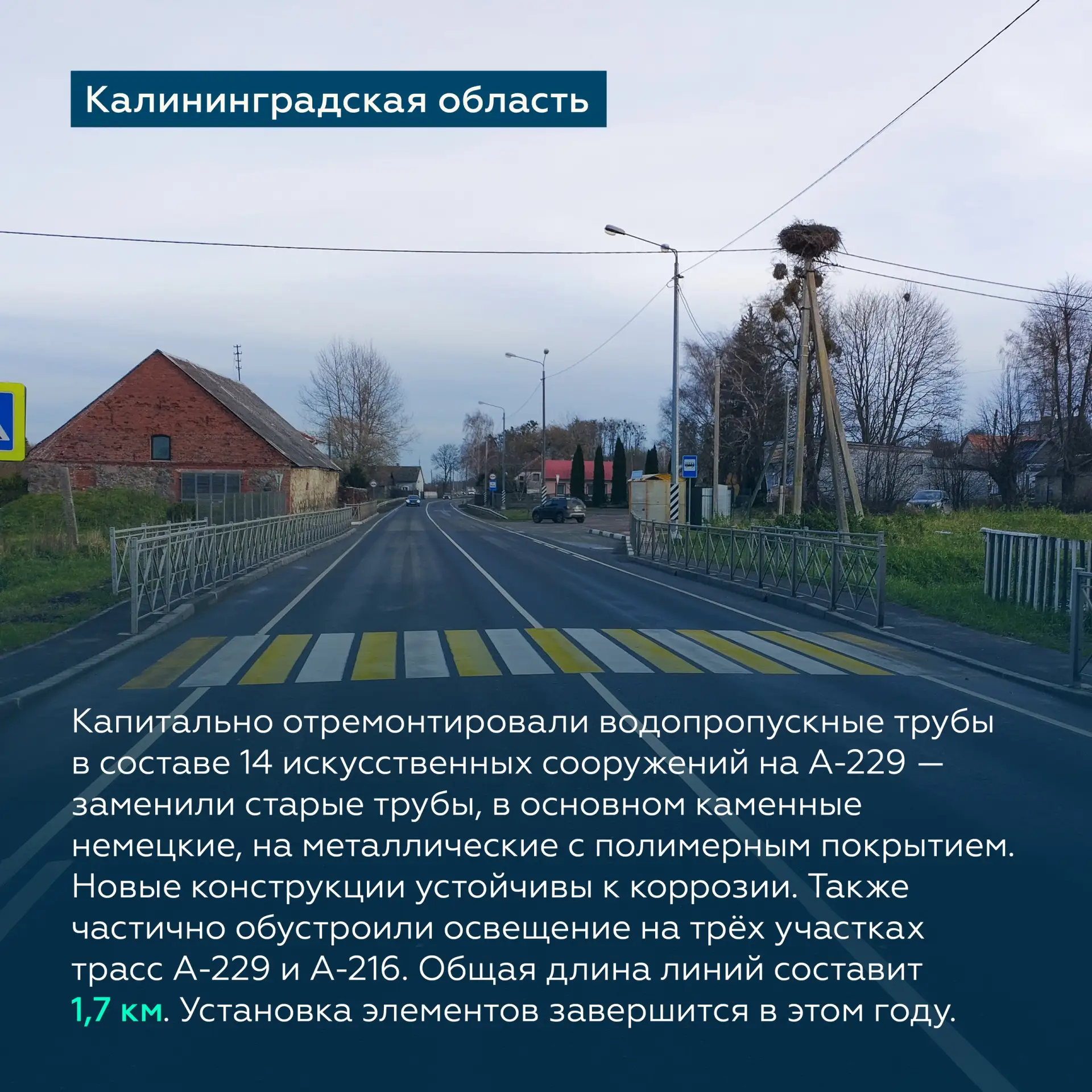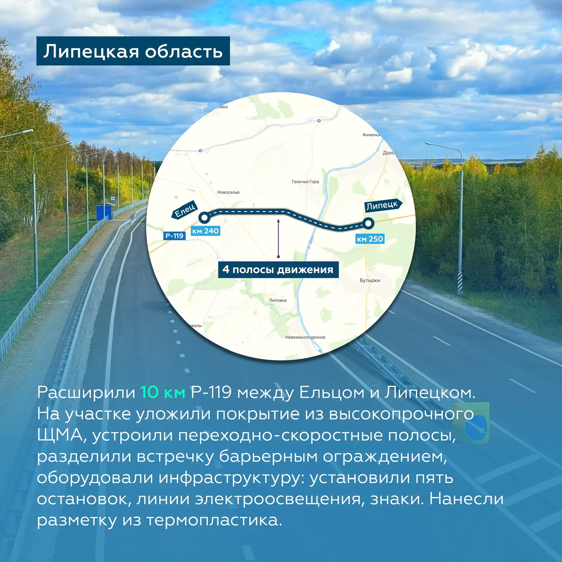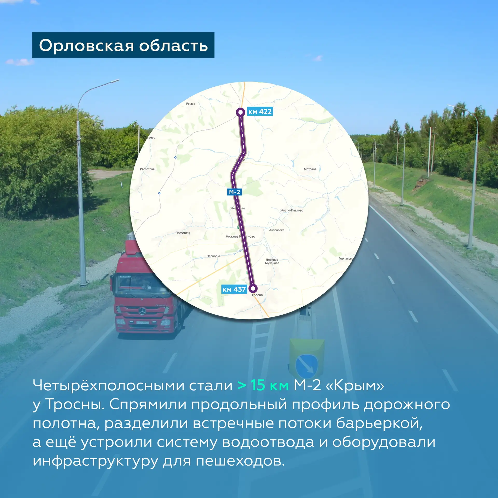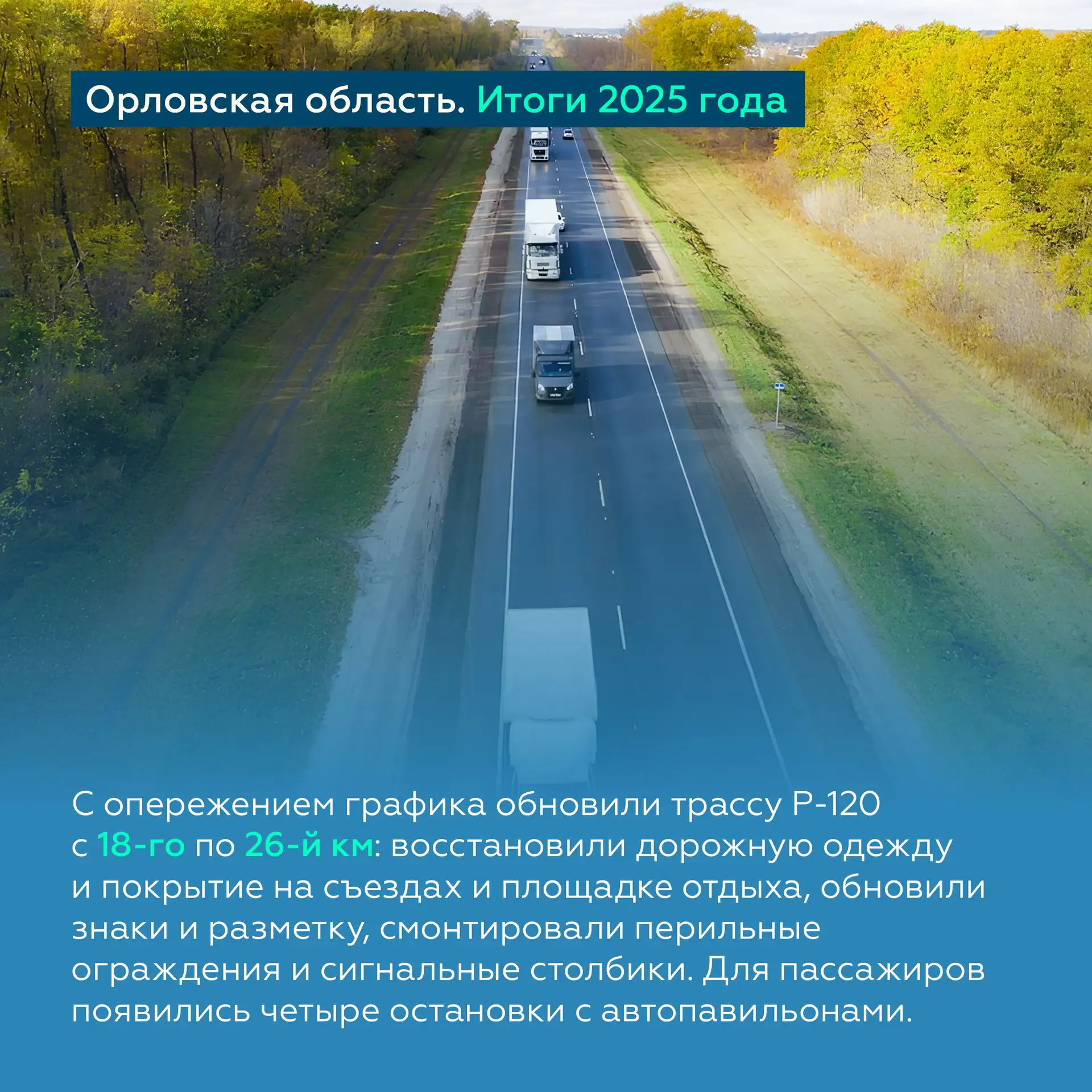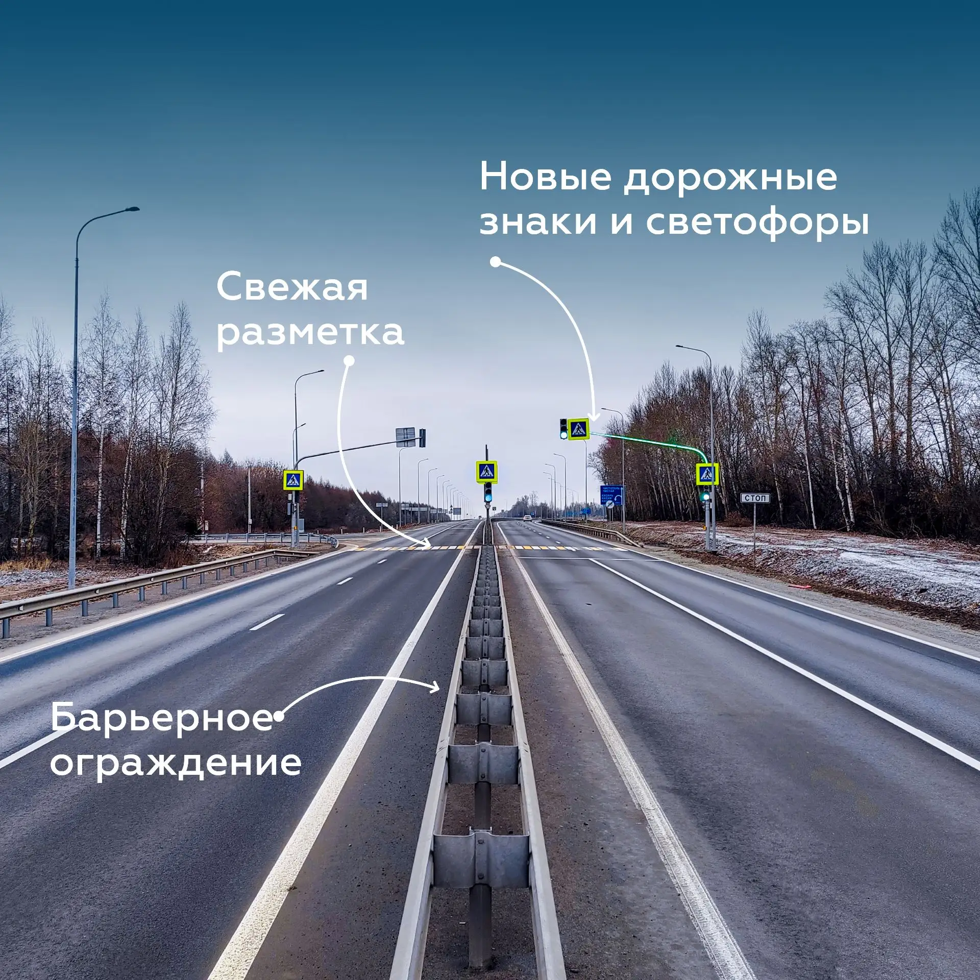 Помимо этого, обновим водопропускные трубы, восстановим обочины, установим барьерное ограждение и дорожные знаки, приведём в порядок остановки и нанесём свежую разметку.