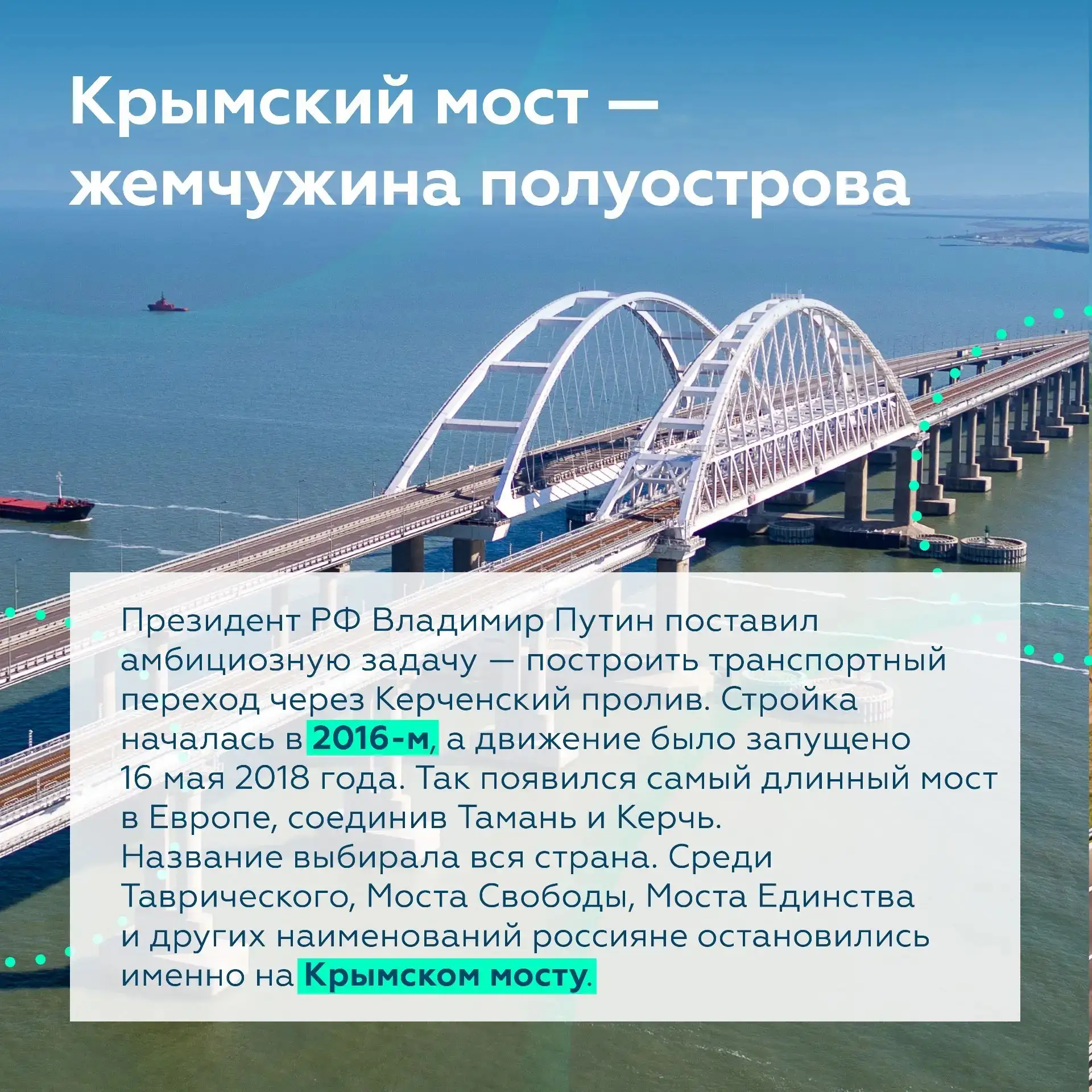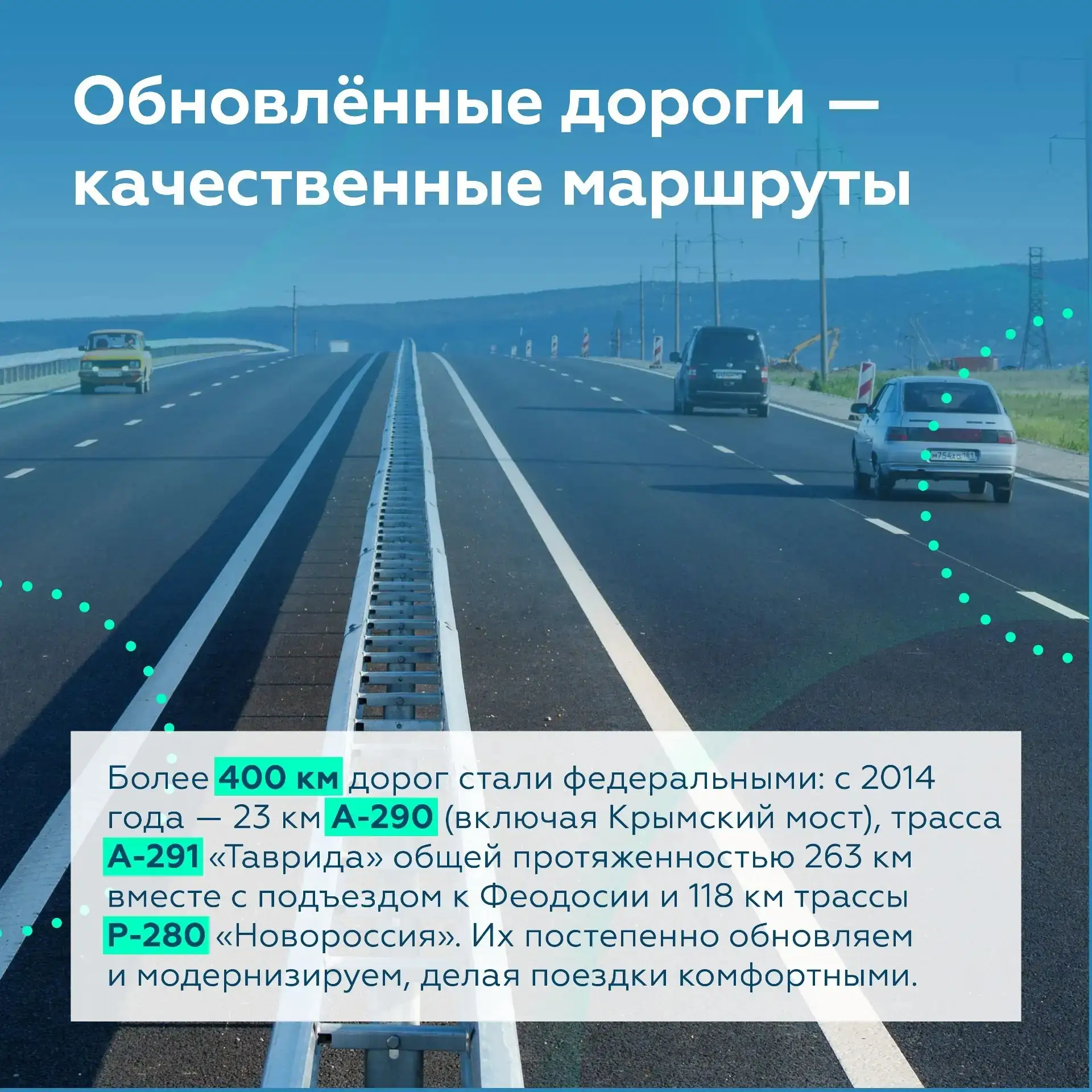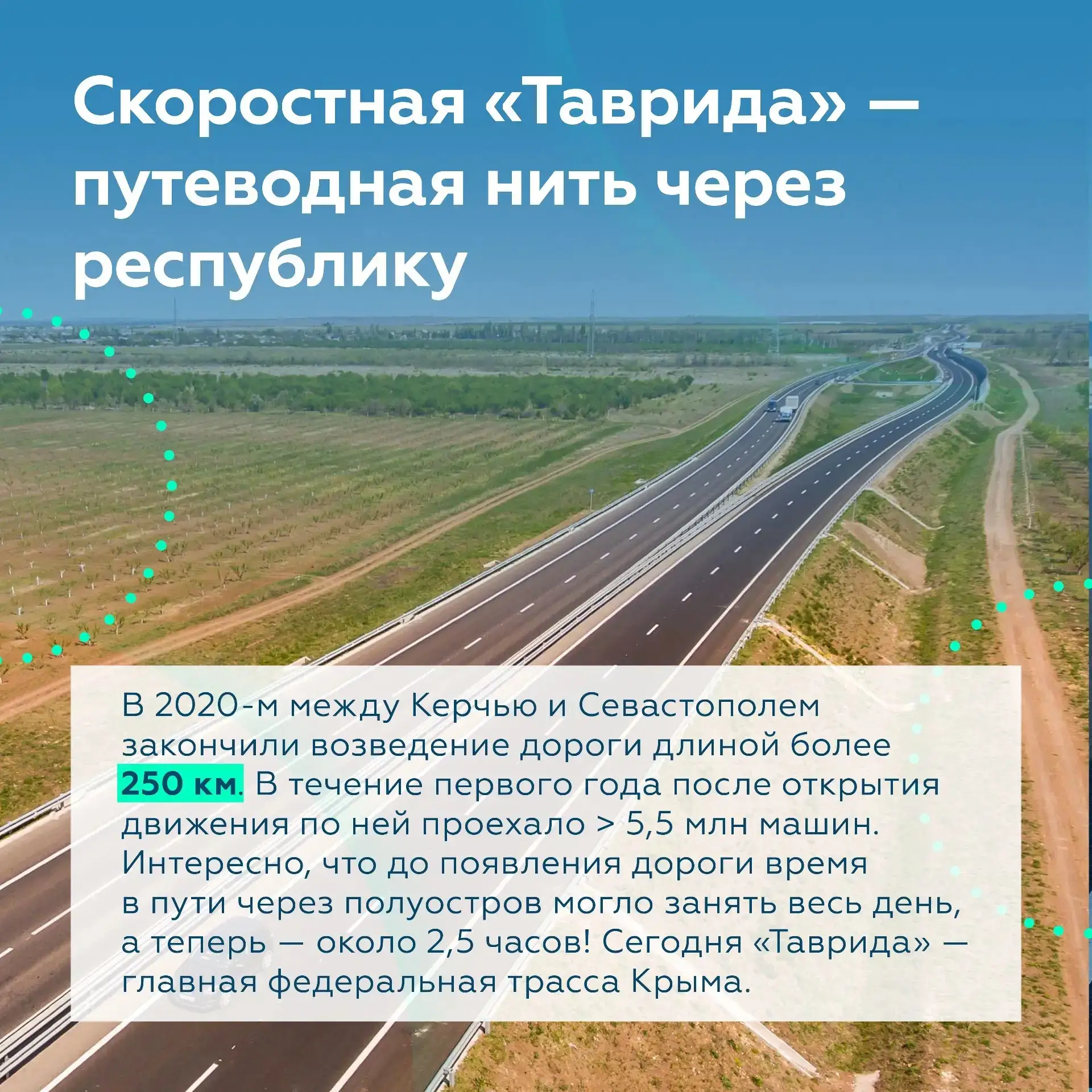 Этот этап положил начало крупнейшим дорожным проектам в современной истории — стройке Крымского моста, самого длинного моста Европы, и трассы «Таврида», которая сократила время в пути с 6 до 2,5 часов.
