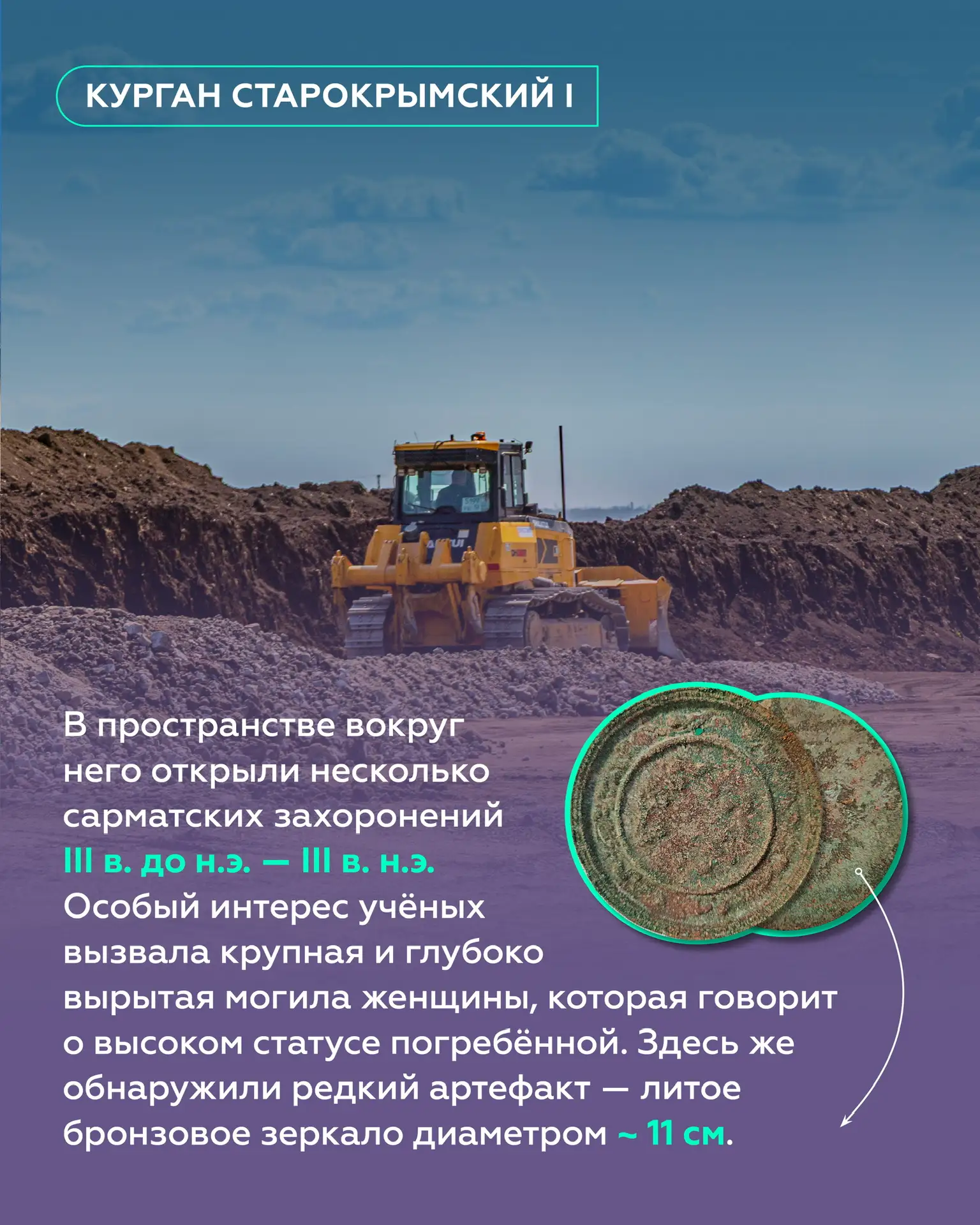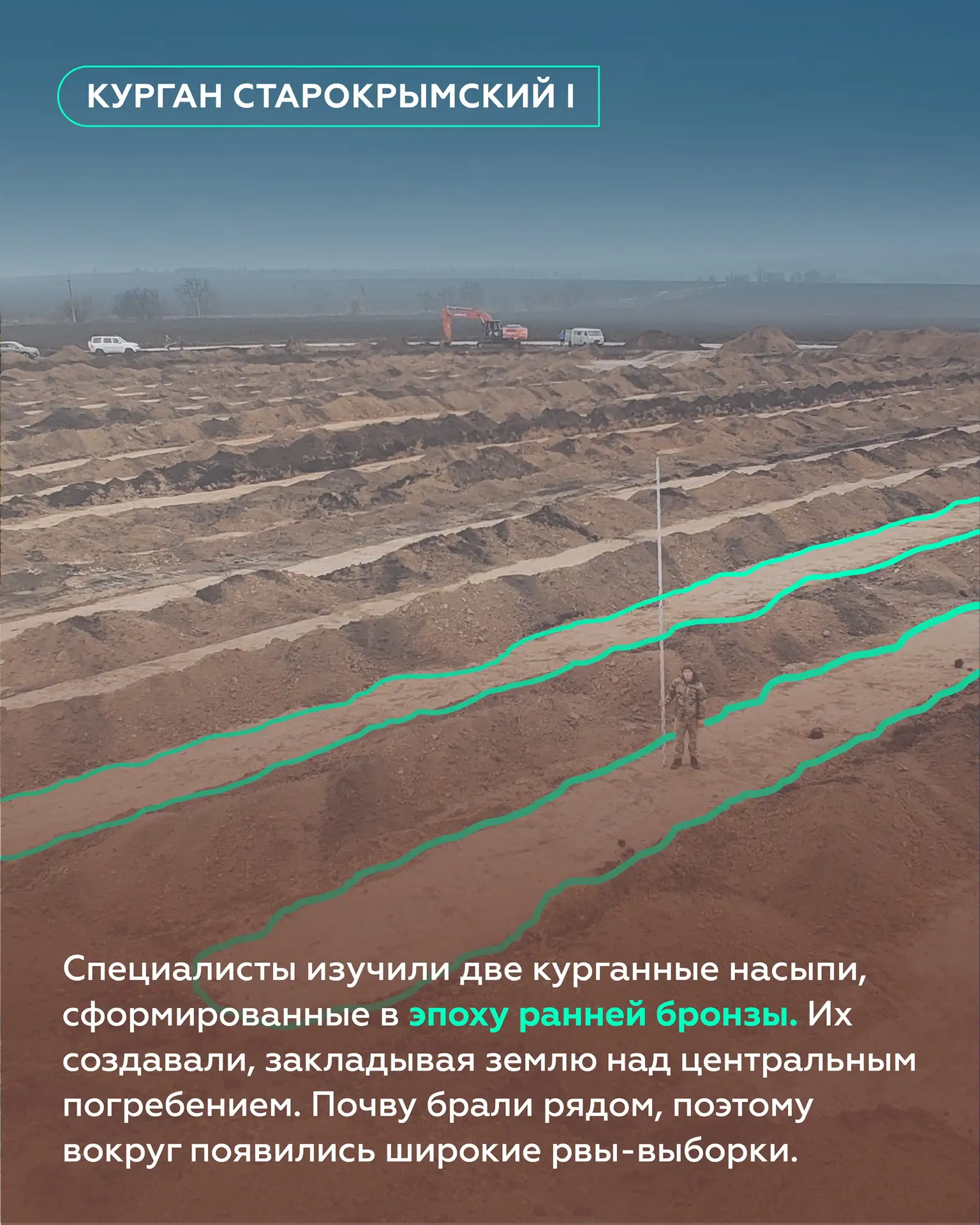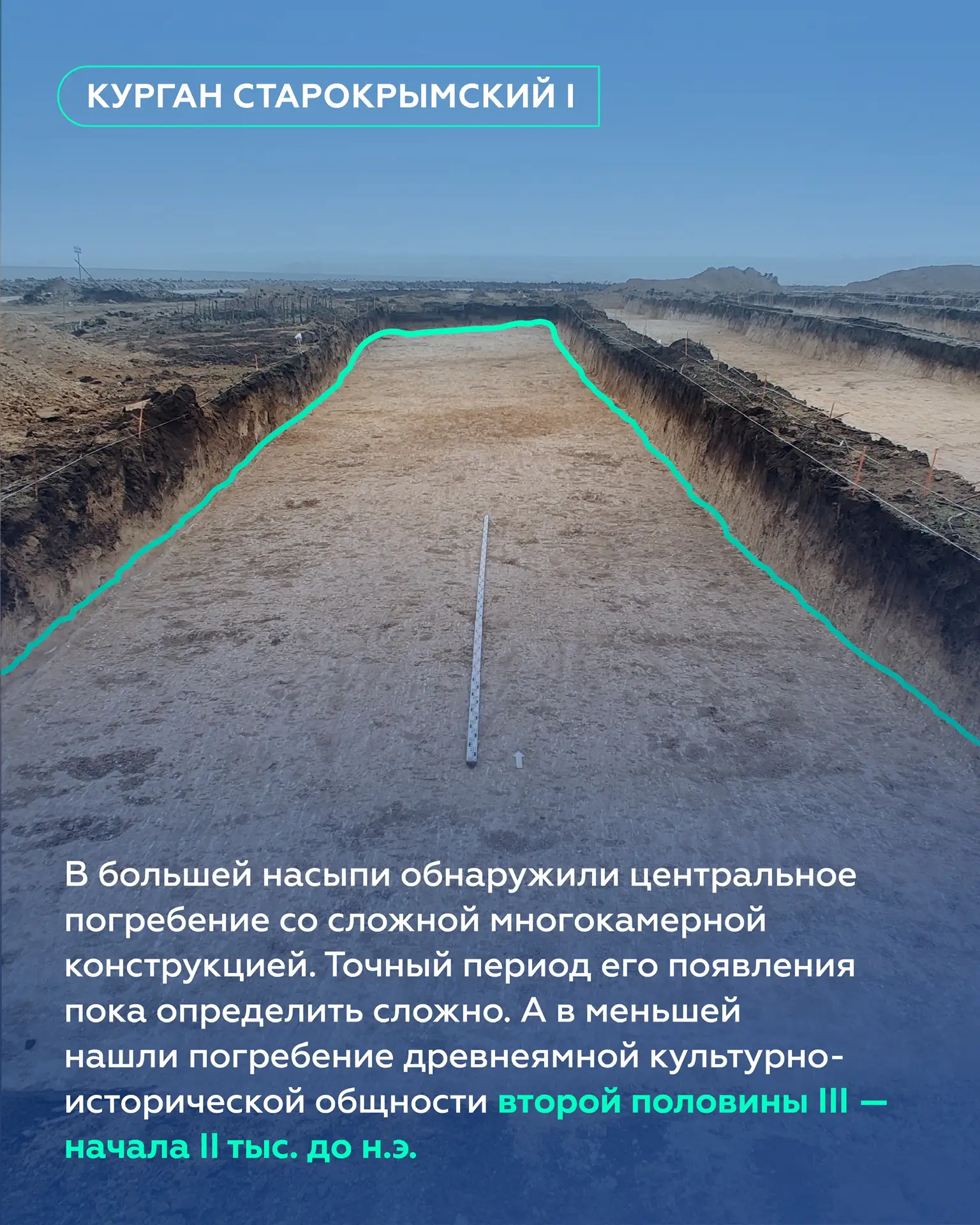 В кургане Старокрымский I осмотрели две насыпи, где выявили погребальные комплексы, датируемые от эпохи ранней бронзы до первых веков нашей эры и принадлежащие к различным культурам.