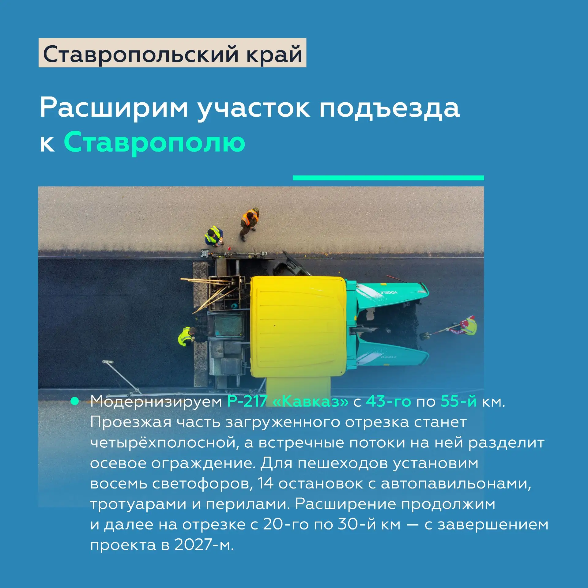 Активные работы идут на подъезде к Ставрополю в составе Р-217 «Кавказ». До конца этого года планируем завершить их с 43-го по 55-й км, а до конца 2027 года — с 20-го по 30-й км.