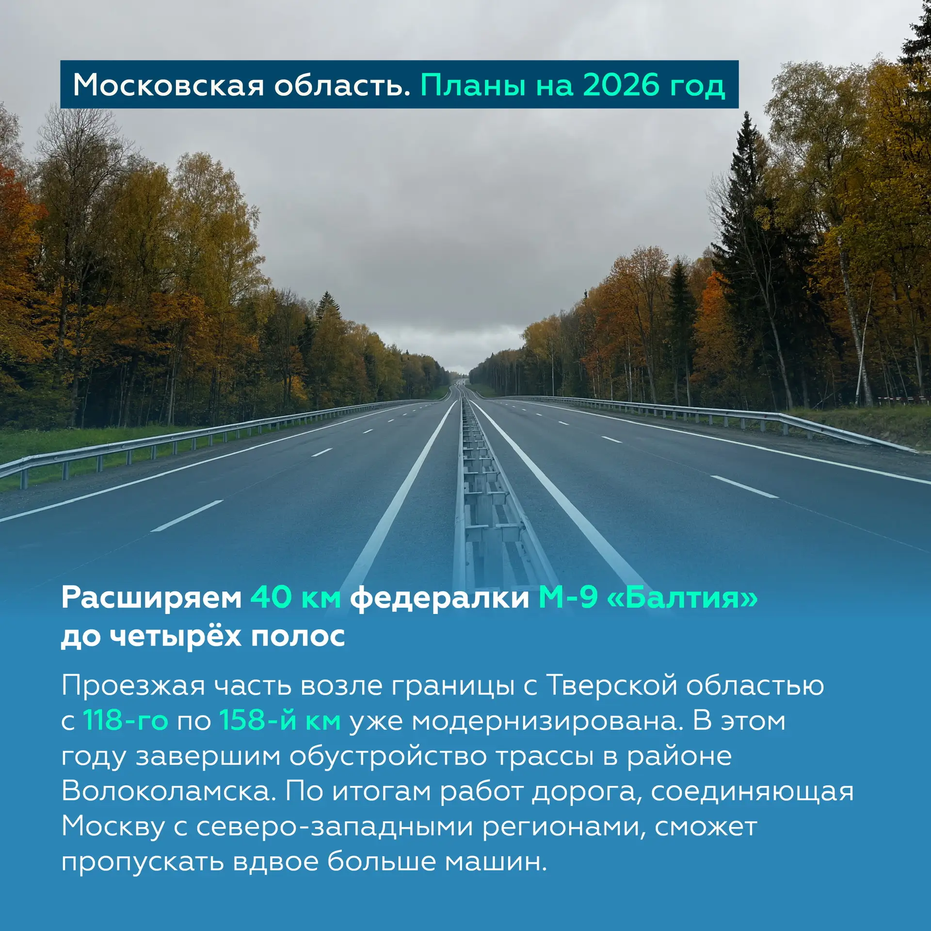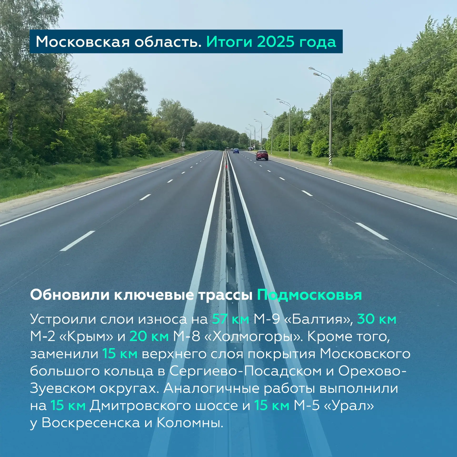 В этом году планируем обновить ещё более 100 км. Кроме того, продолжим модернизацию дорожной сети Подмосковья, уделяя внимание расширению ключевых направлений.