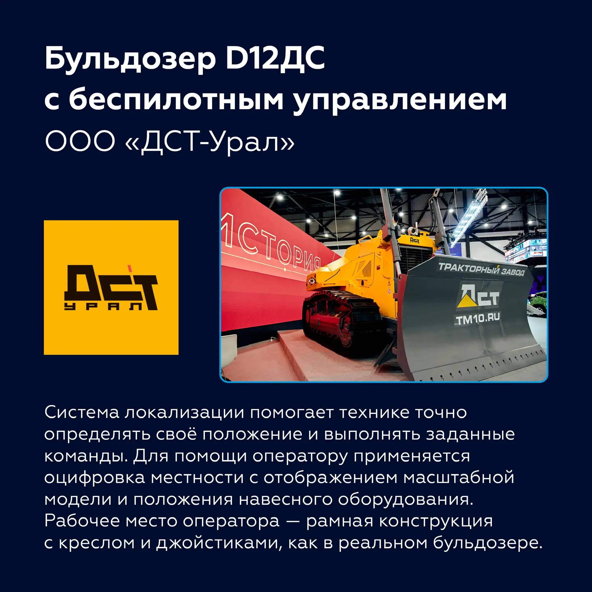 На выставке впервые продемонстрировали широкой публике роботизированные модели отечественного производства: асфальтоукладчик «Десна 2100 БП», бульдозер D12, каток ДМ-7,7-ВВ и универсальную машину МУМ 500.