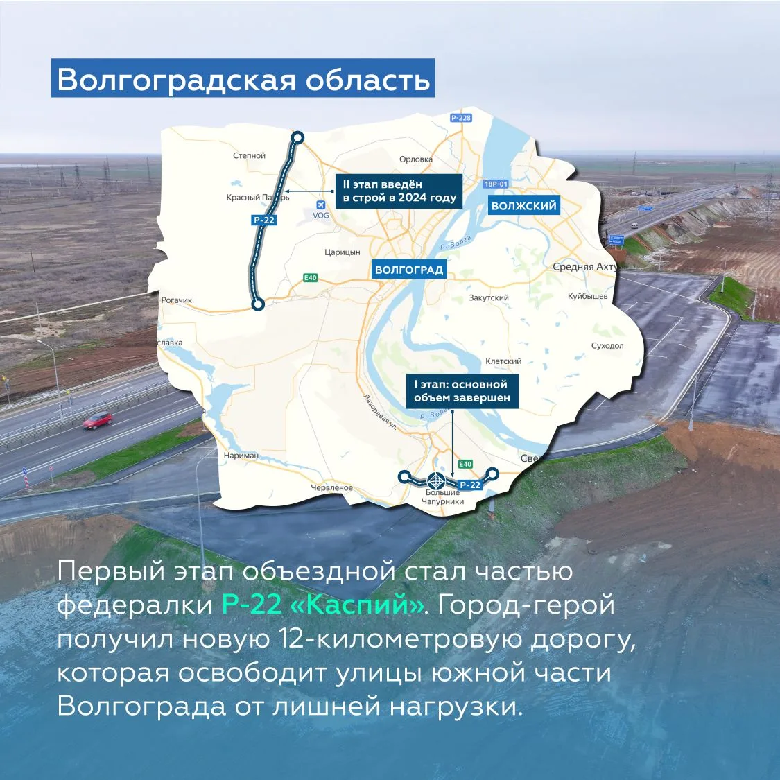 Напомним, что это один из трёх этапов большого обхода Волгограда, протяжённость которого составит 70 км. Проект третьего этапа, который соединит первые два, уже получил согласование Госэкспертизы.