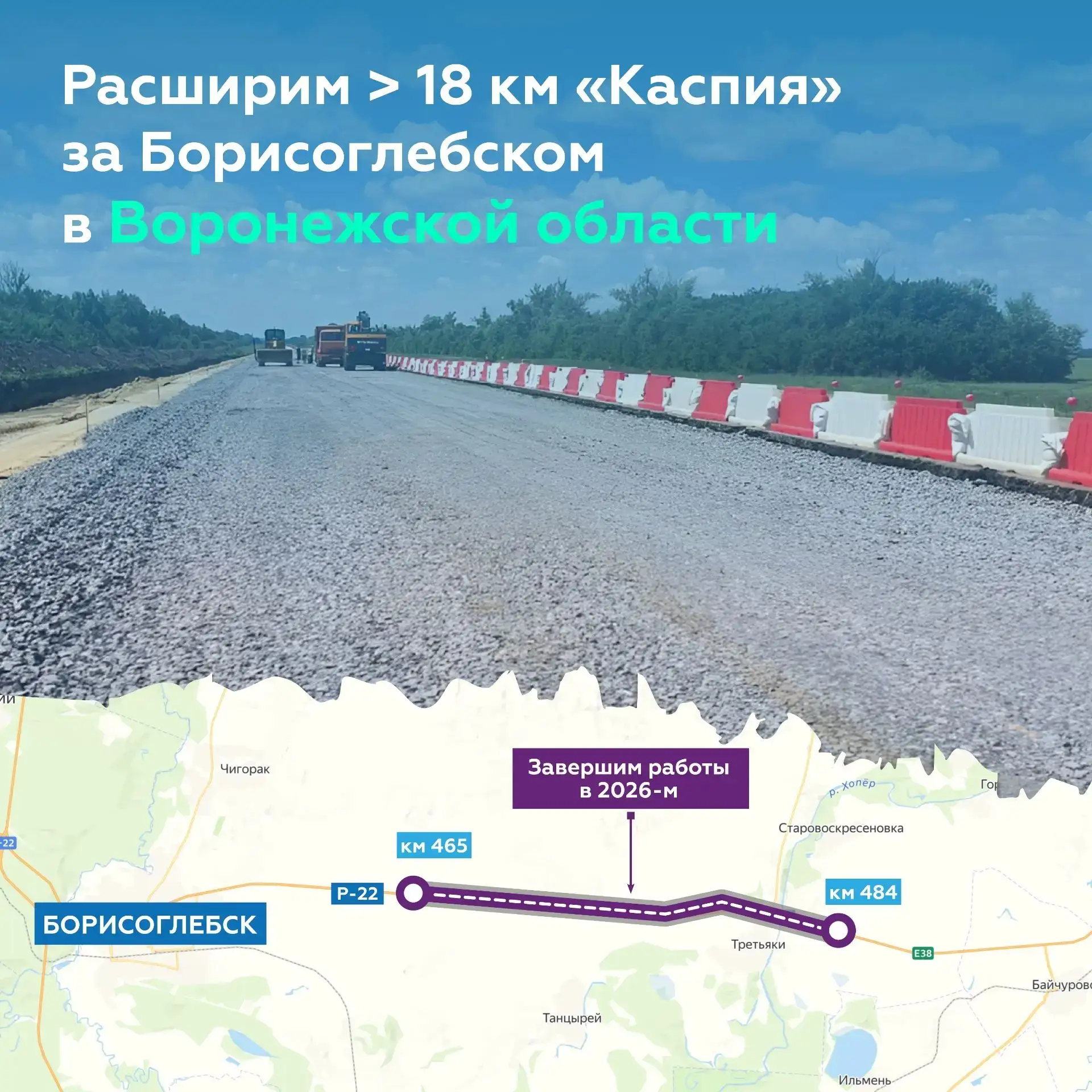 С началом весны продолжим работы на 18-километровом участке в составе Р-22 «Каспий» (подъезд к г. Саратову) в Воронежской области, где расширим дорогу до четырёх полос. Объект готов на 29 %.