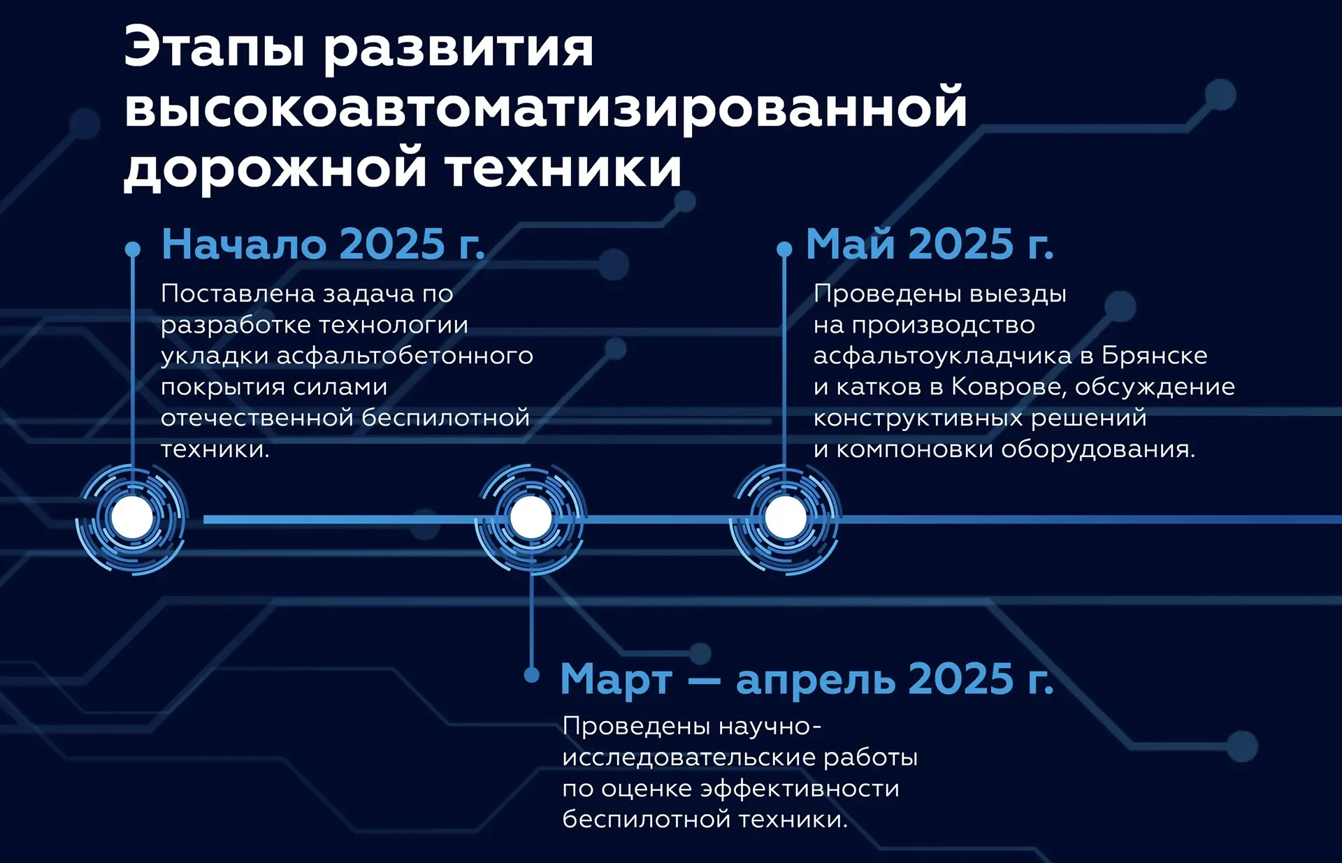 В рамках инициативы дорожную технику оснастят сенсорами и интерфейсами, позволяющими умной машине «понимать» команды бортового компьютера вместо движения рычагов оператором и управляться машинным «зрением». При всём том техника сохранит работоспособность даже при потере сигнала GNSS или связи.