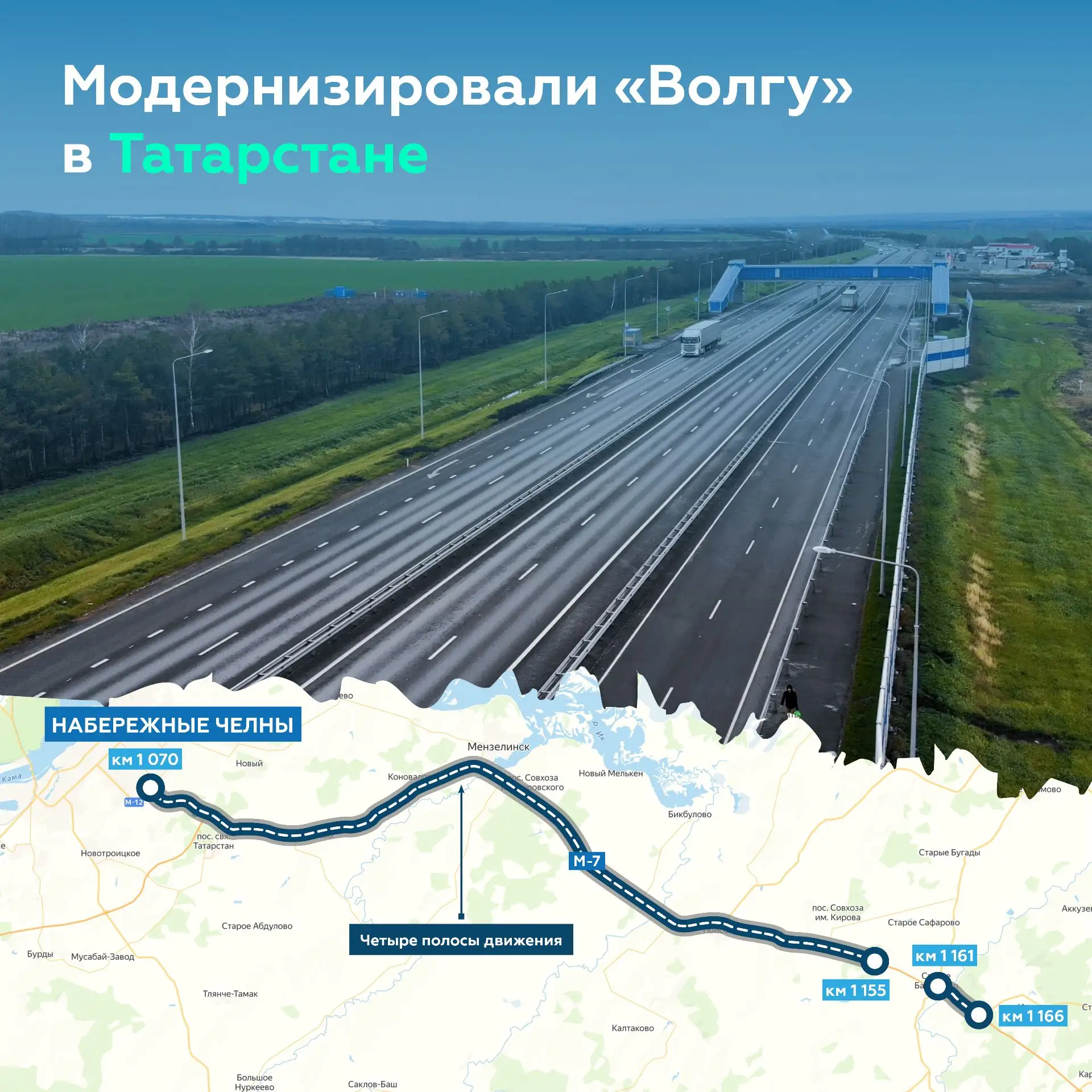 Завершили дорожные работы от Набережных Челнов до границы с Башкортостаном. Так, после модернизации трассы с 1 070-го по 1 166-й км проезжая часть стала ещё безопаснее для движения — сегодня водители едут по двум полосам в каждом направлении.