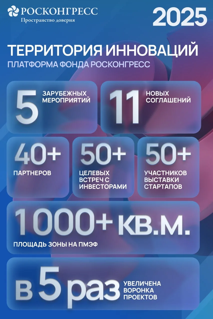В 2025 году «Территория инноваций» поразила участников ПМЭФ своим масштабом — на площади более 1️⃣0️⃣0️⃣0️⃣ кв. метров были представлены прорывные разработки ведущих российских компаний и научных учреждений. Работа по продвижению наших технологий была продолжена на деловых форумах за рубежом.
