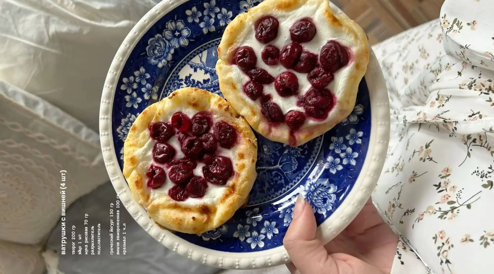 смешать творог, яйцо, рисовую муку, разрыхлитель и подсластитель. разделить тесто на 4 части, сформировать шарики и сделать в центре углубление. выложить заготовки на противень, застеленный пергаментом. для начинки смешать греческий йогурт с крахмалом и подсластителем. заполнить углубления йогуртовой начинкой, сверху выложить размороженную вишню. выпекать в разогретой до 180 градусов духовке около 20–25 минут до румяности.