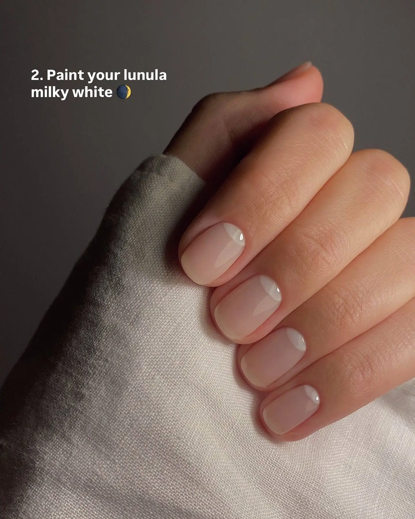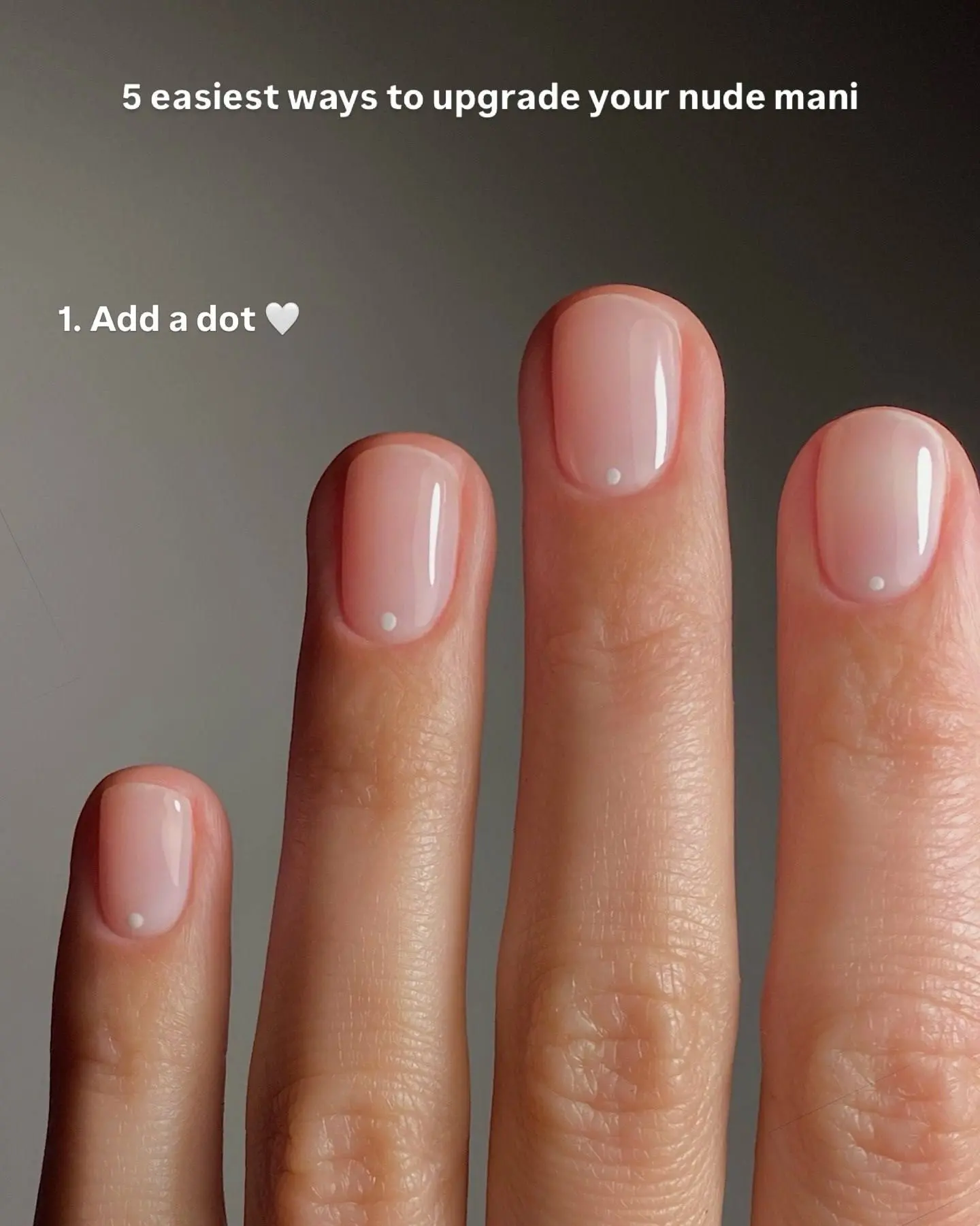 ✨Белые/разноцветные точки у основания ногтя, лунный маникюр, объемное сердечко, ультра-тонкий френч и сатиновый/матовый топ с блюр эффектом.