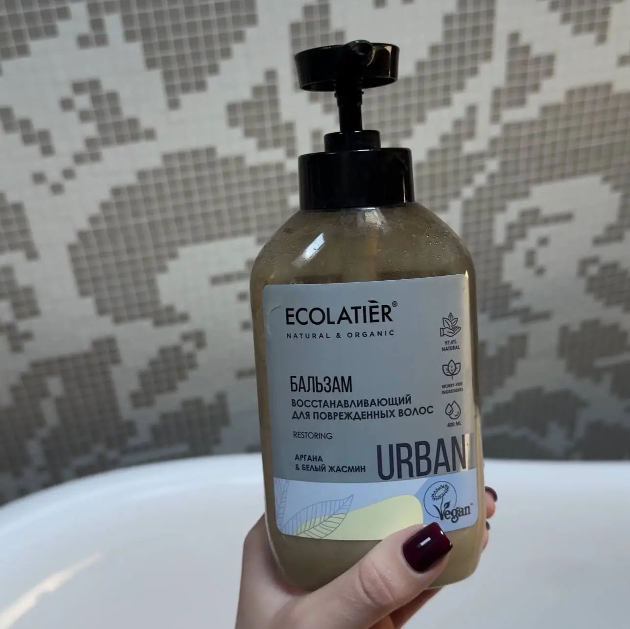 Девочки, сохраняйте. Это ecolatier restoring с арганой и белым жасмином. Волосы после него очень мягкие и рассыпчатые!