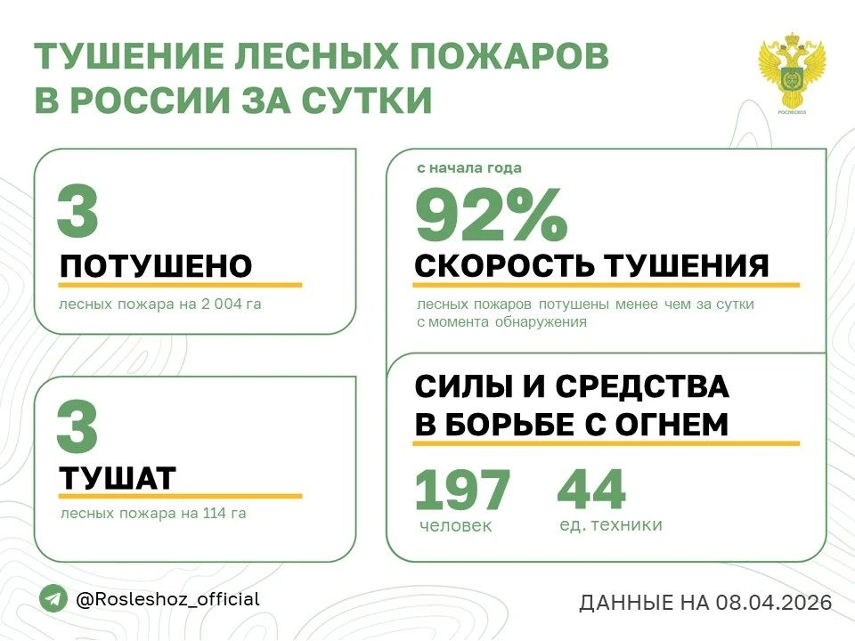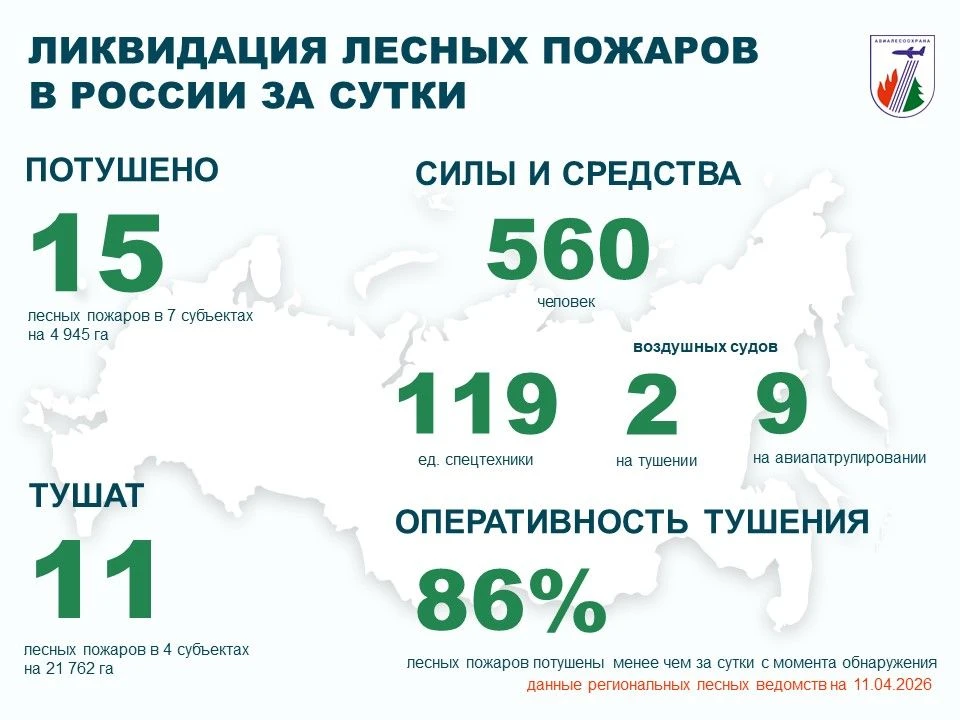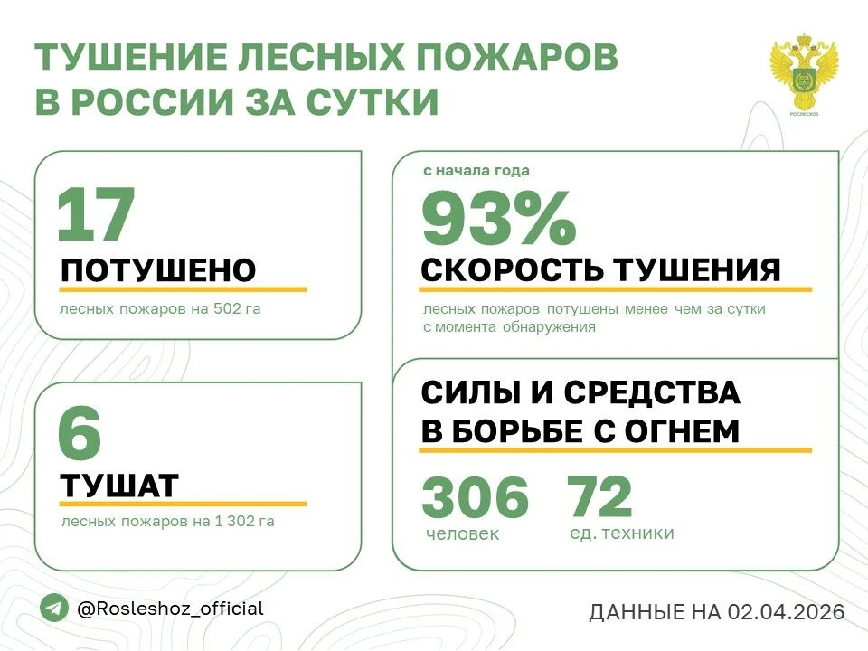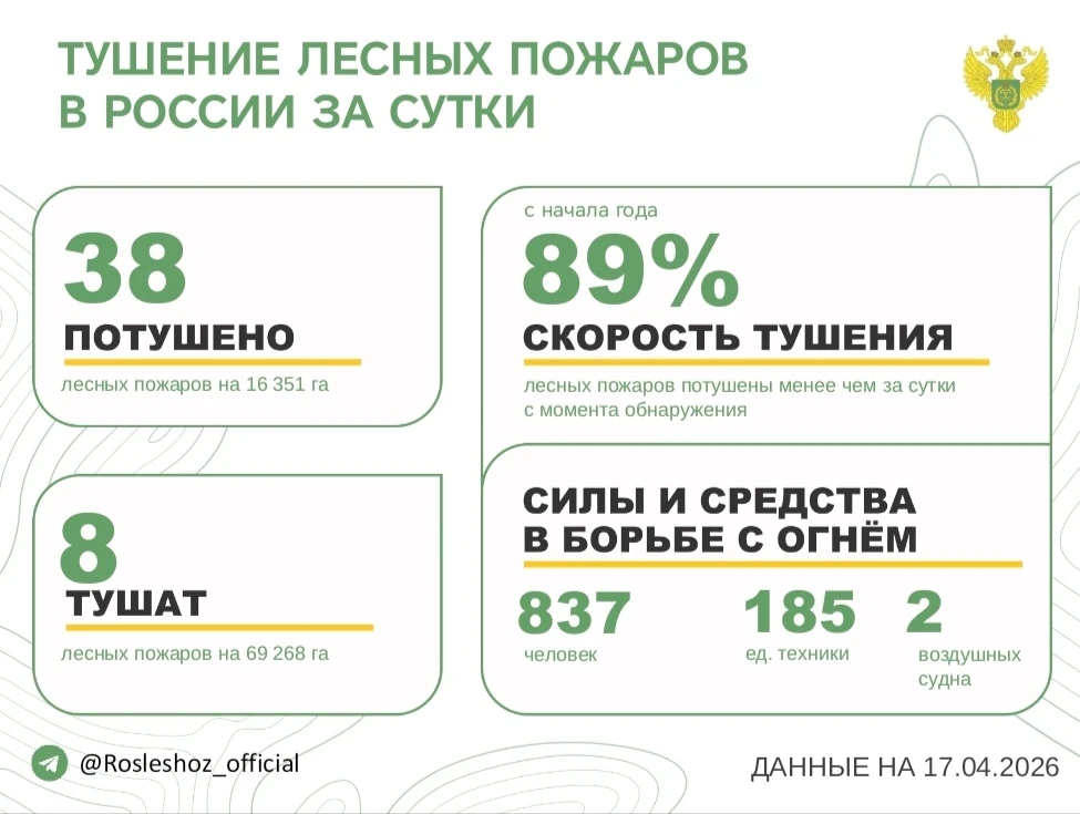 🟢 За прошедшие сутки в 7 регионах России потушили 17 лесных пожаров.