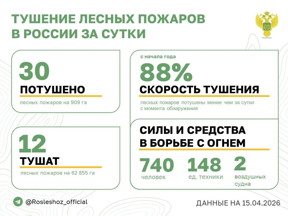 🟢 За прошедшие сутки в 9 регионах России потушили 30 лесных пожаров.