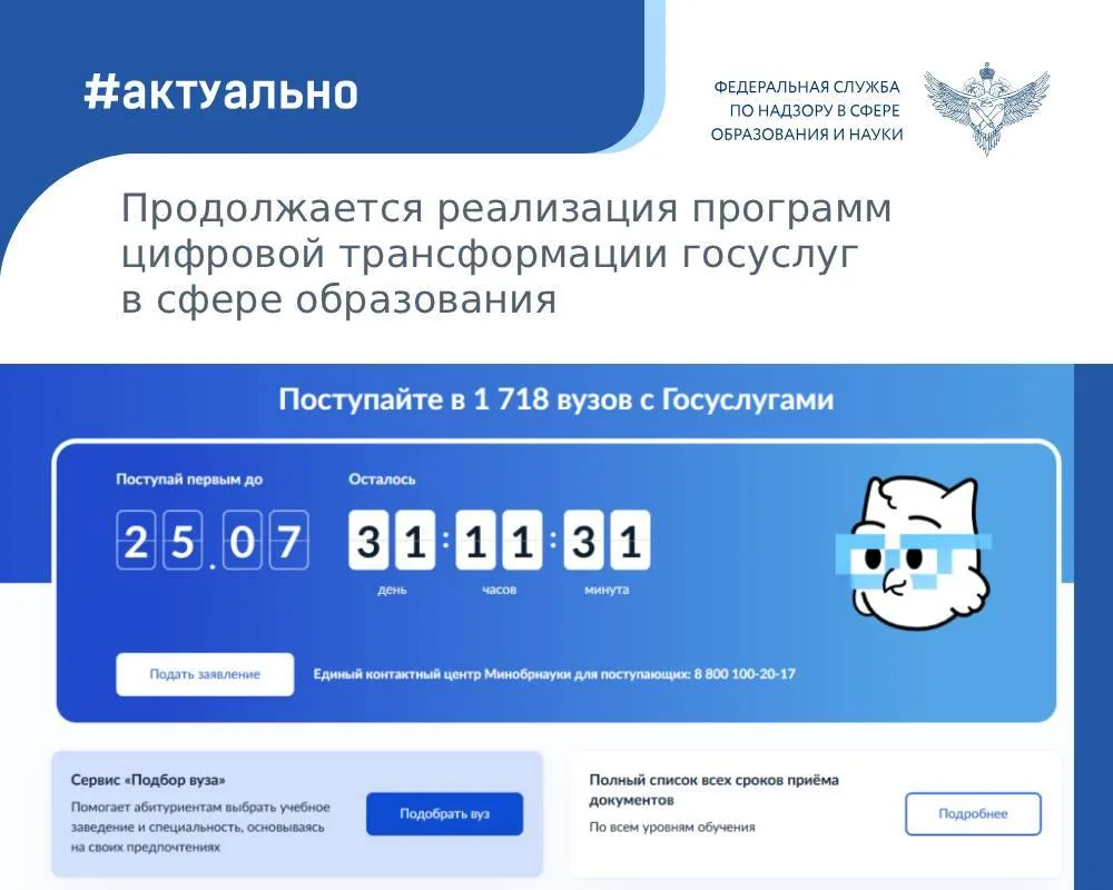 Так, Рособрнадзор совместно с Минобрнауки и Минпросвещения реализовали на Госуслугах сервис для поступления в вузы онлайн. В рамках приёмной кампании 2025 года сервисом воспользовались свыше 2 млн абитуриентов, которые подали более 5,6 млн заявлений. К сервису подключены 1172 вуза и научные организации, а также 566 их филиалов и 819 организаций, реализующих программы среднего профессионального образования при вузах. Заложен ряд обновлений на 2026 год (например, вузы смогут распределять контрольные цифры приёма с учётом целевой кадровой потребности).