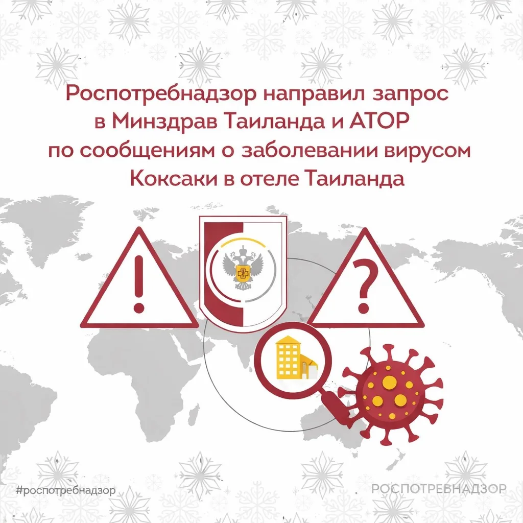 ℹ️ В связи с появлением в СМИ сведений о том, что у нескольких российских туристов во время отдыха в одном из отелей в курортном городе Кхао-Лак появились симптомы вируса Коксаки, Роспотребнадзор направил в Министерство здравоохранения Таиланда запрос о предоставлении официальных данных по результатам расследования и об оценке риска возможного ухудшения эпидемиологической ситуации.