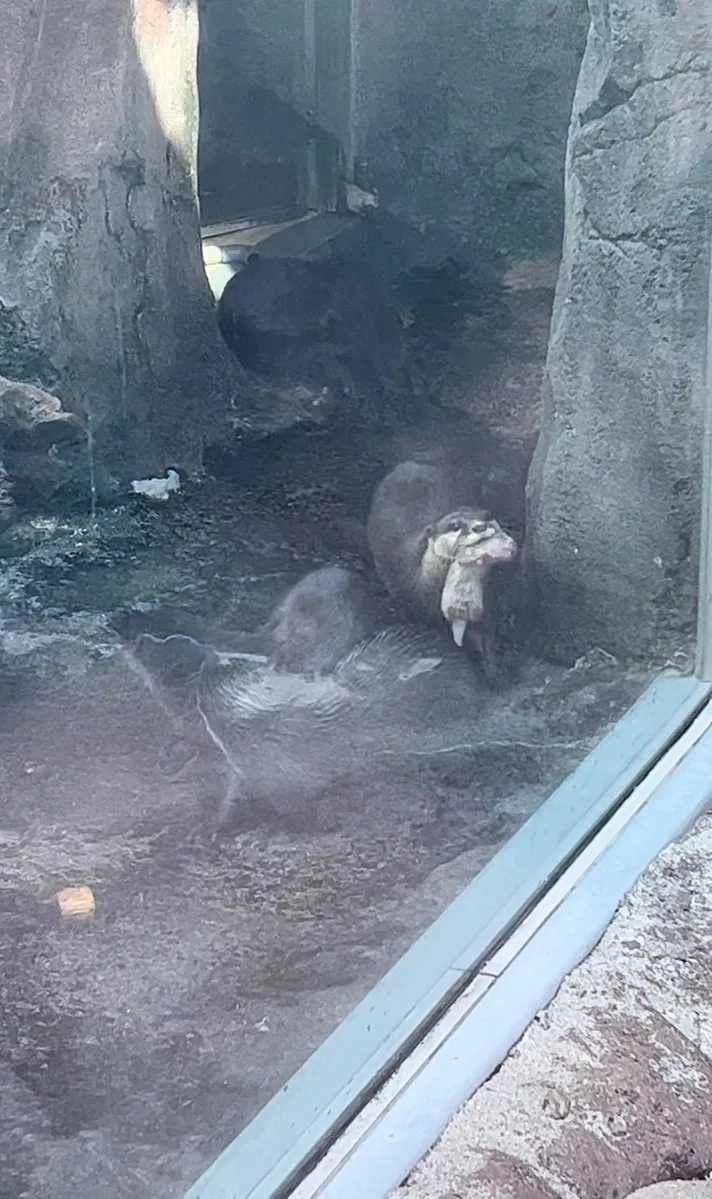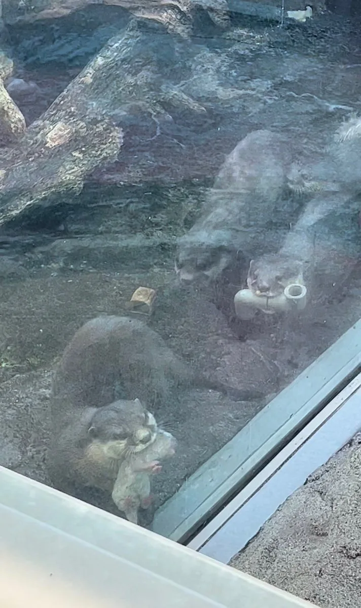 В японском зоопарке мама-выдра вышла к людям, чтобы показать своего детёныша, а её друг решил похвастаться...куском трубы.