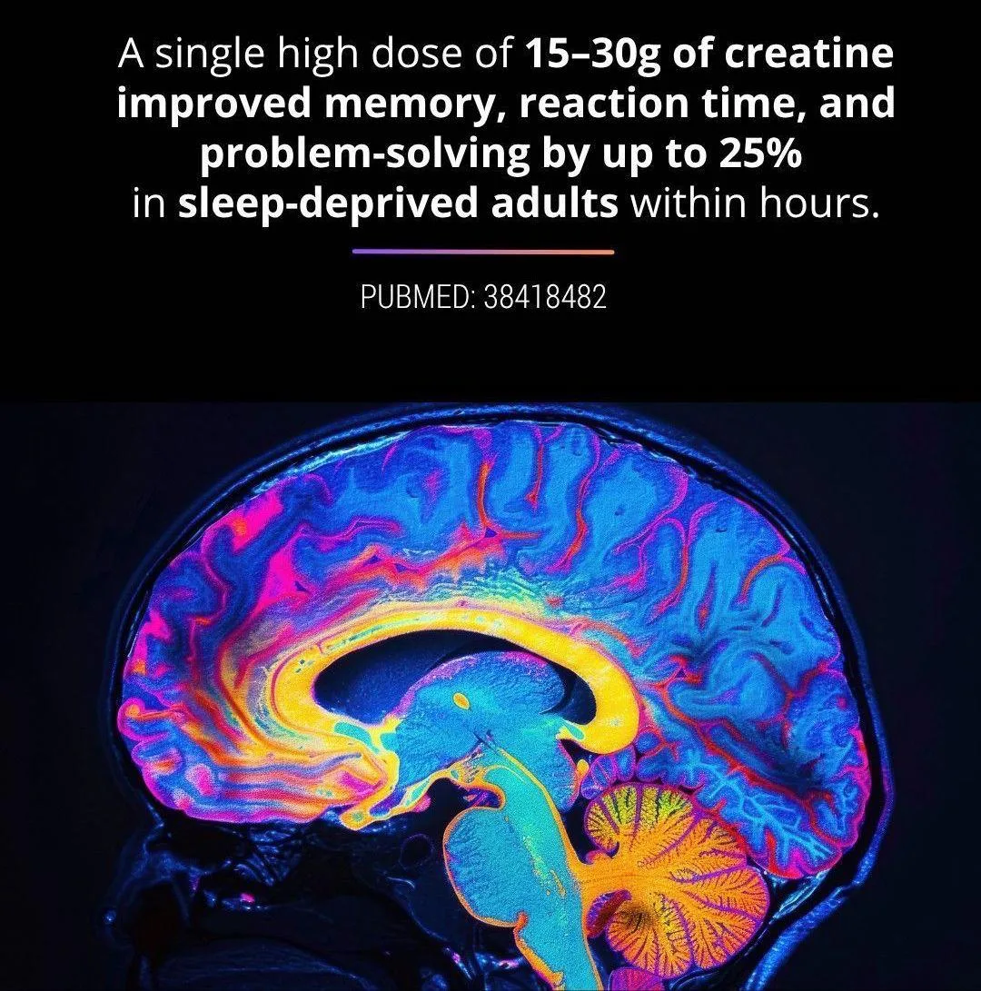 В эксперименте участвовали 15 взрослых, которые не спали более 20 часов — им дали 20 г креатина и их когнитивные способности выросли: