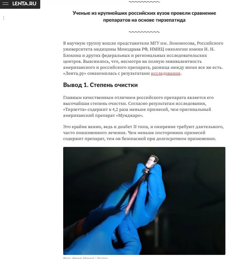 Опубликованы результаты сравнительного исследования препаратов на основе тирзепатида — российской Тирзетты и американского Мунджаро.