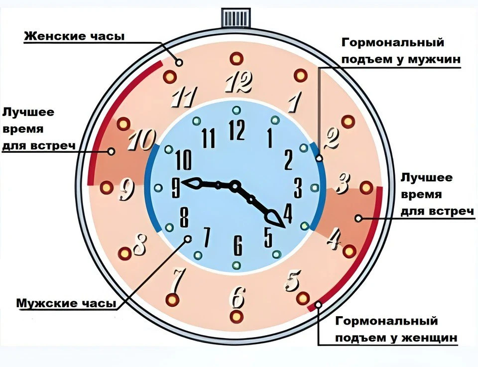 Наложив часы друга на друга, получаем наиболее благоприятное время для лучших интимных контактов — с 9 до 10 утра, с 15 до 16 дня, с 21 до 22 вечера и с 3 до 4 ночи.
